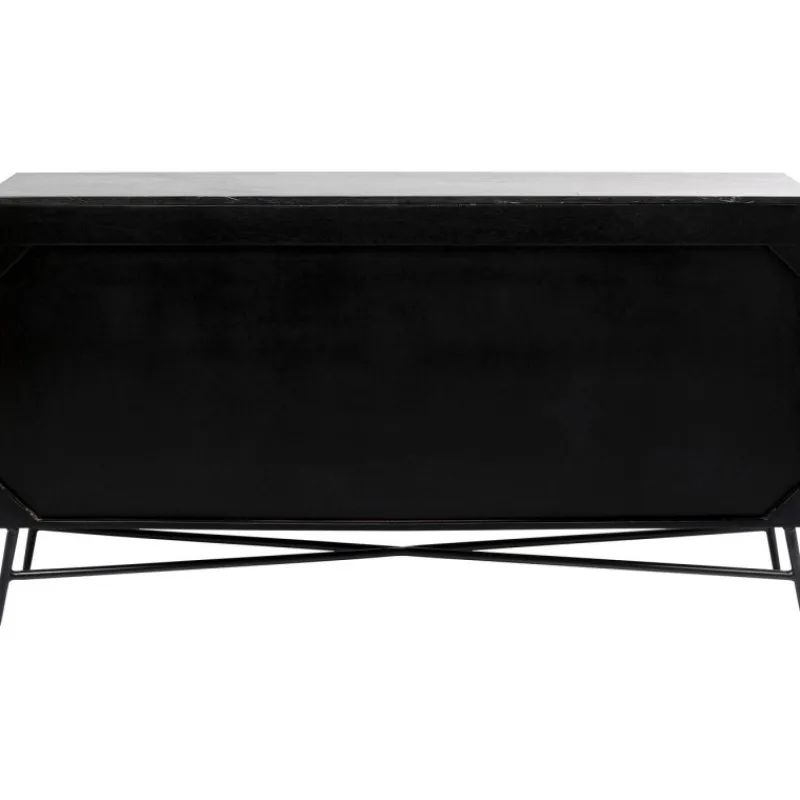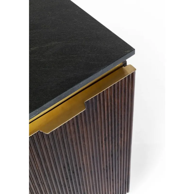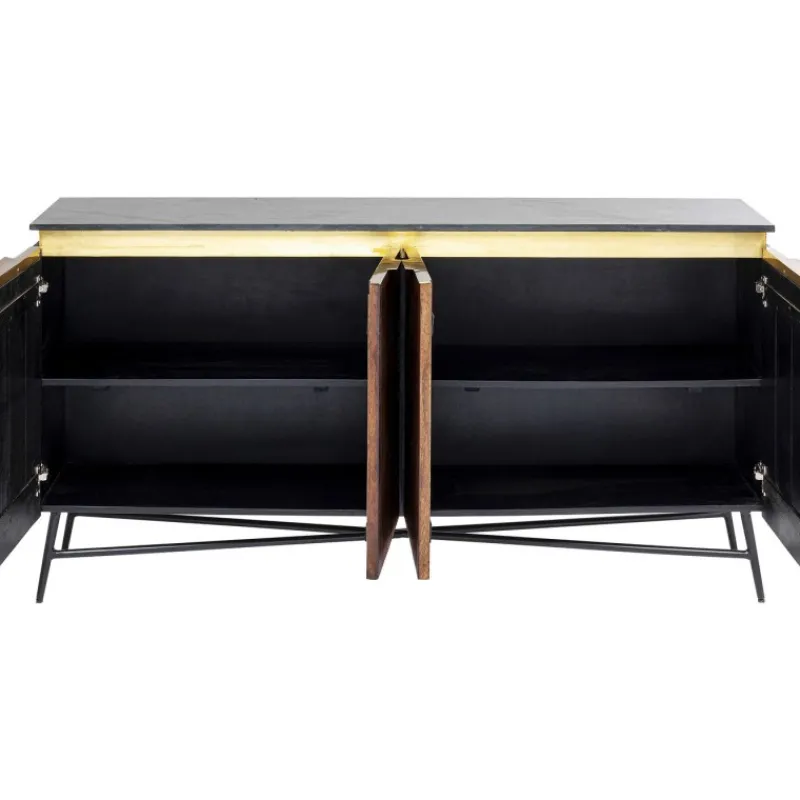 Com grande atenção aos, no caso deste aparador moderno tudo foi pensado. Esta peça de mobiliário luxuosa pertence sem dúvida à primeira liga. A madeira fina de manga lacada escura harmoniza excecionalmente bem com a parte superior de mármore escuro e as pernas de metal preto. O que torna o aparador acima de tudo incomparável e um ponto de atenção especial é a base dourada feita de latão, que está localizada entre a placa superior e as frentes surpreendentemente afuniladas. Amplo espaço de armazenamento fornecido por compartimentos atrás das quatro portas com duas prateleiras removíveis. Os puxadores planos garantem uma abertura fácil e tornam o aparador ainda mais elegante. Os seus objetos decorativos favoritos têm um lugar adequado garantido na sala de estar ou quarto, no tampo de mármore de alta qualidade. Aparador escuro feito de madeira sólida com tampo de mármore genuíno. Quatro portas que fecham facilmente graças à função de fecho suave. O aparador é fornecido totalmente montado
