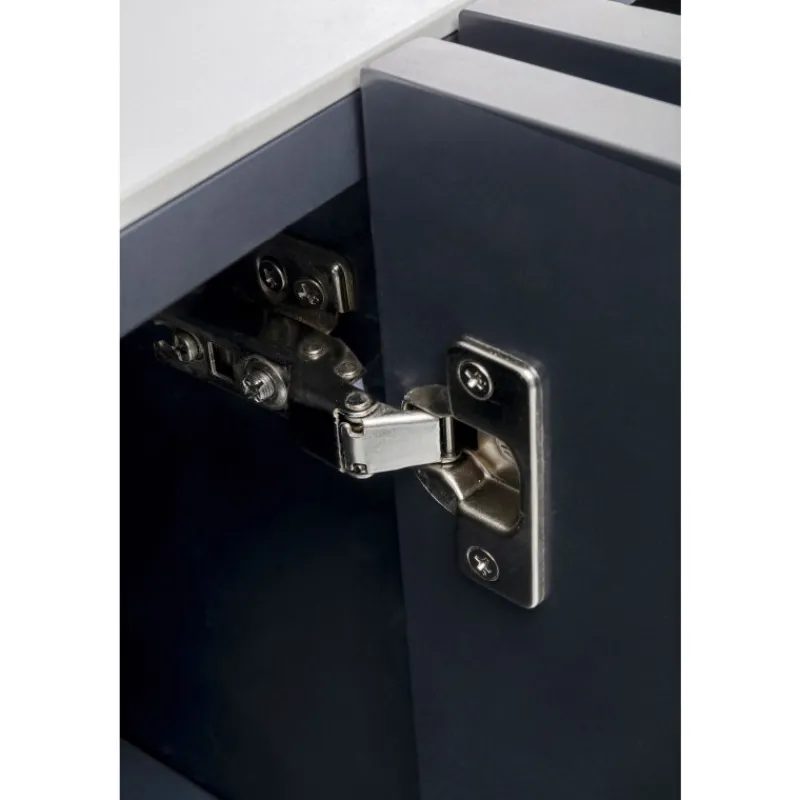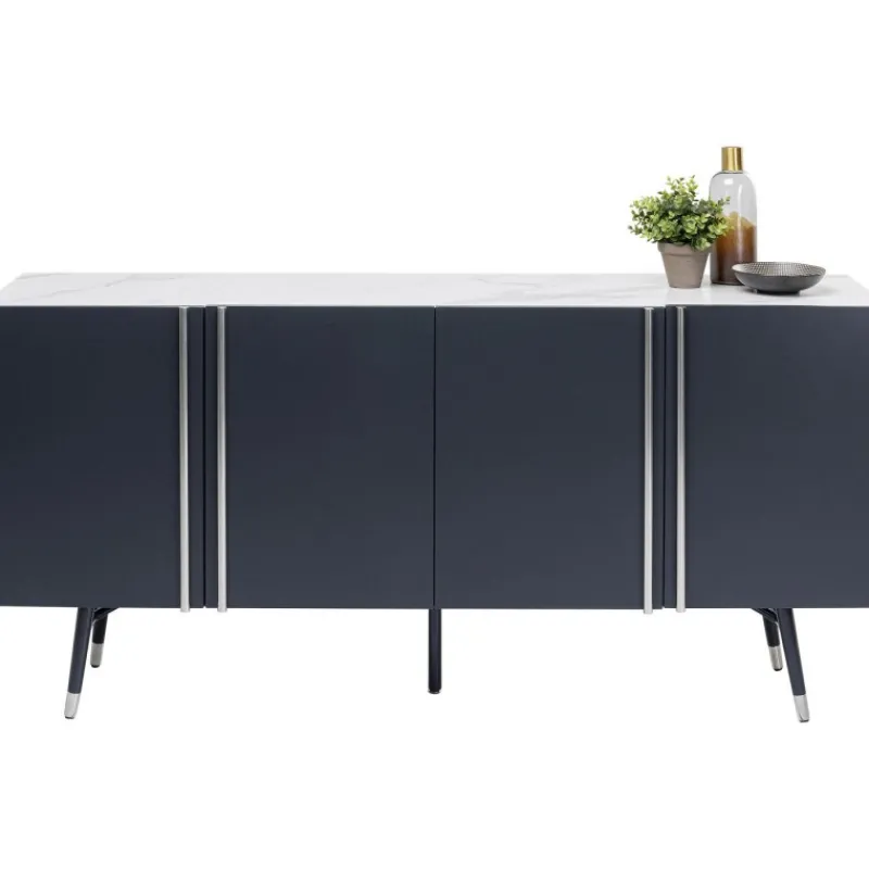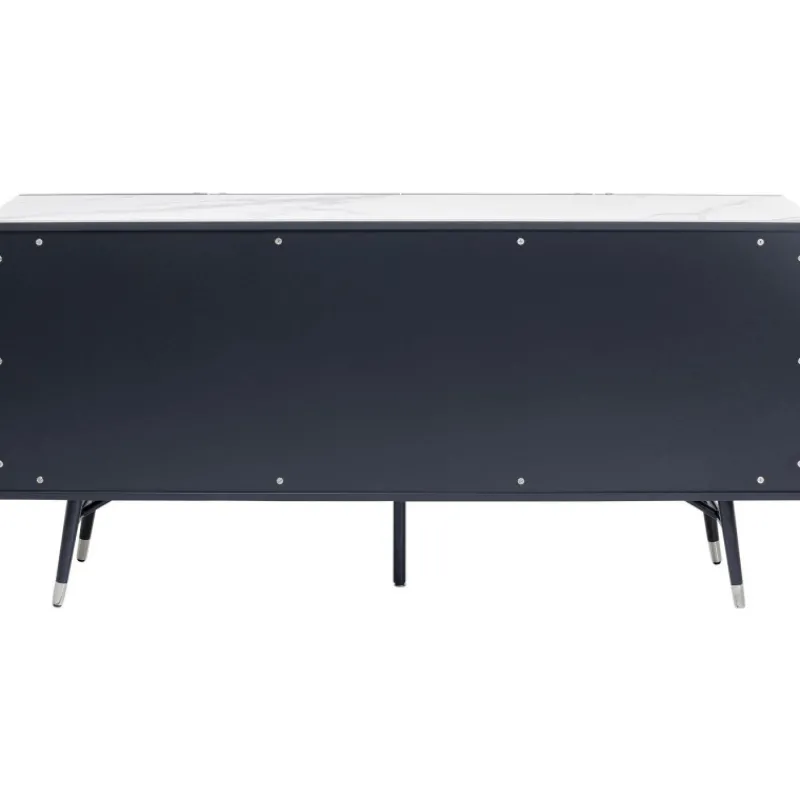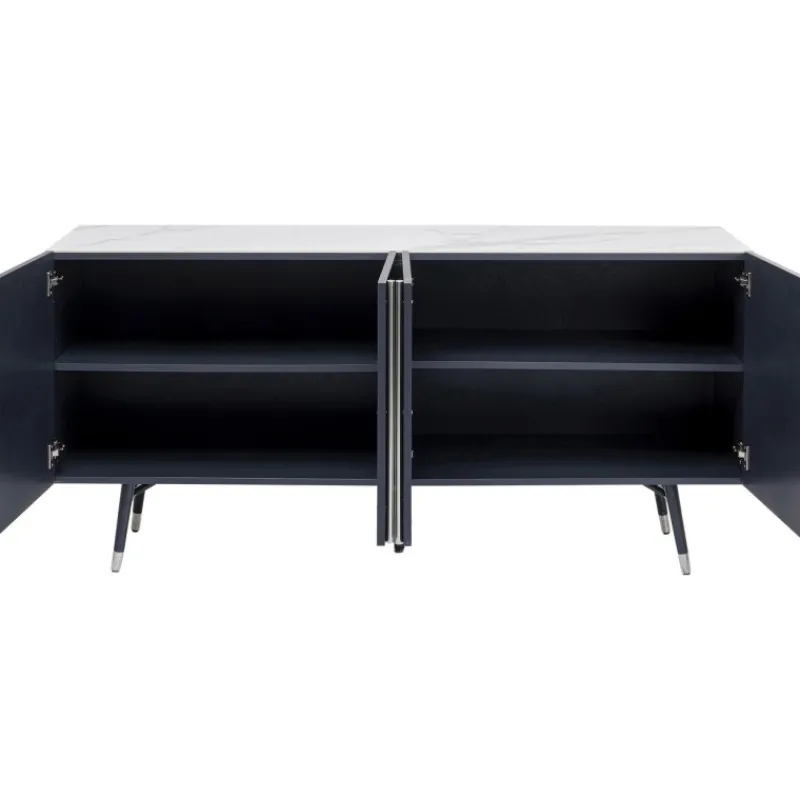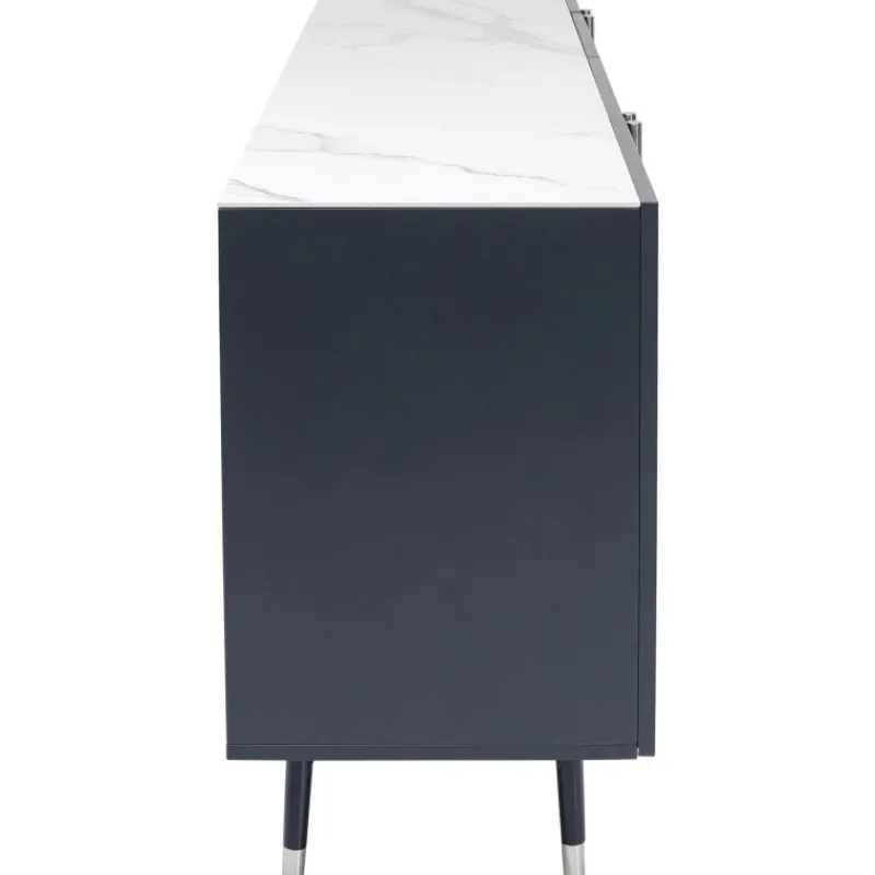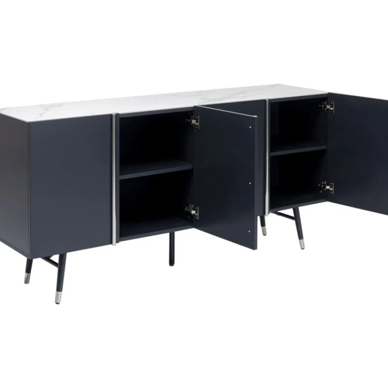 Este aparador moderno em cinzento escuro com detalhes em prata e tampo de vidro com efeito de mármore foi desenhado exclusivamente pelo designer dinamarquês Morten Georgsen. Cada conjunto de portas abre para um grande compartimento de armazenamento com prateleiras ajustáveis.
