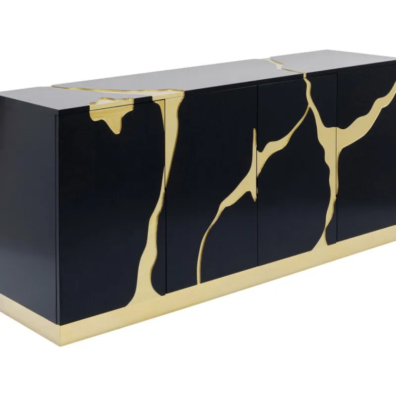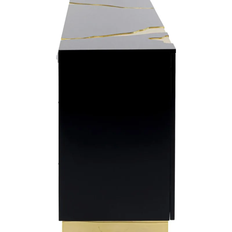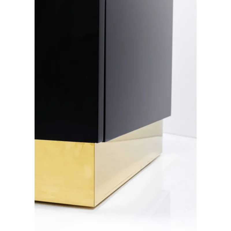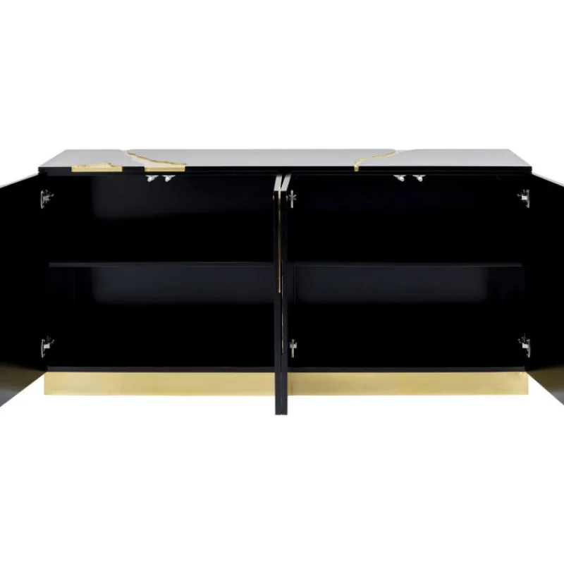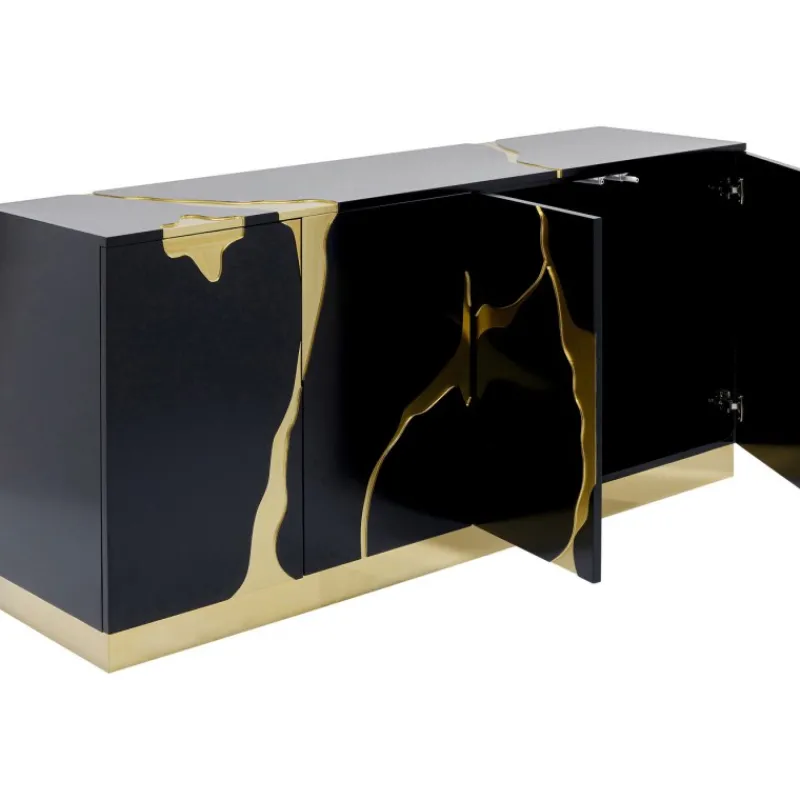 O aparador adicionará um certo toque à sua área de estar! Com o design único da base dourada e das linhas douradas, dá a impressão de que o revestimento preto recebeu um acabamento artístico. Absolutamente criativo e um grande ponto de atenção! O aparador de aspeto de luxo também pode ser utilizado como uma alternativa a uma placa de TV e oferece espaço de armazenamento suficiente com quatro prateleiras ajustáveis. A prática função de empurrar para abrir significa que pode abrir as portas sem a necessidade de puxadores, o que mantém o aspeto limpo e moderno do aparador. Aparador preto e dourado Design marcante com decoração fluida, serrilhada e lacada em ouro. Uma atualização atraente e luxuosa de mobiliário para a sua casa. Abertura conveniente com um leve toque graças à função de empurrar para abrir. Este artigo de mobiliário é fornecido montado.