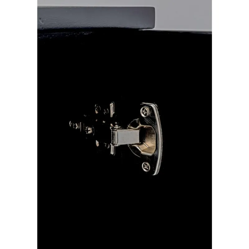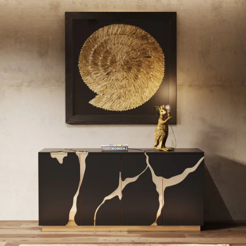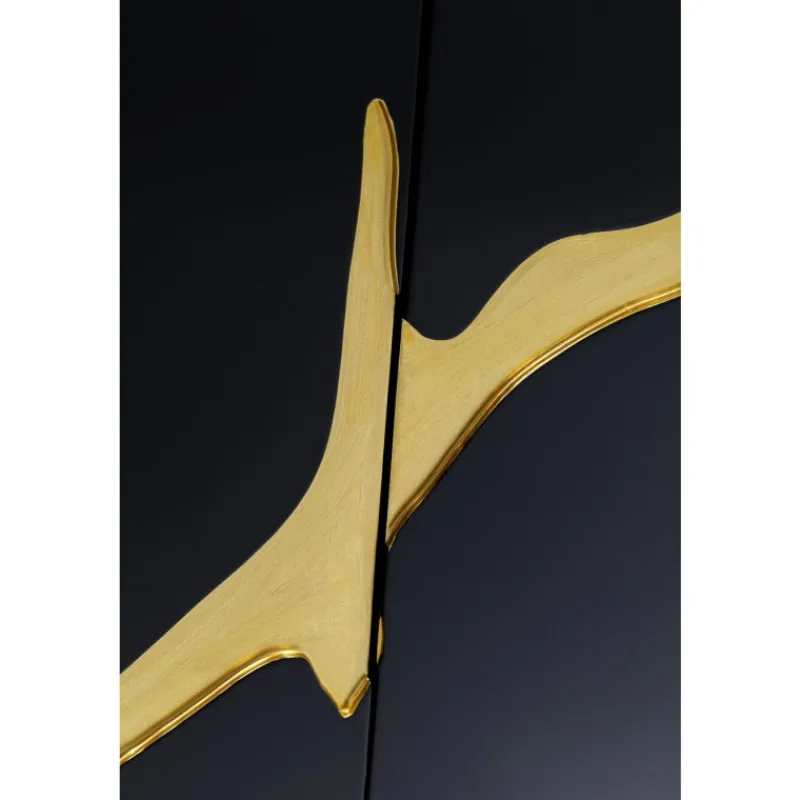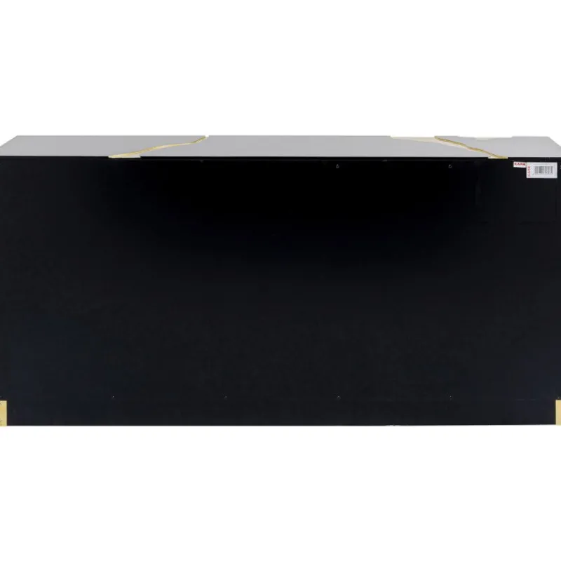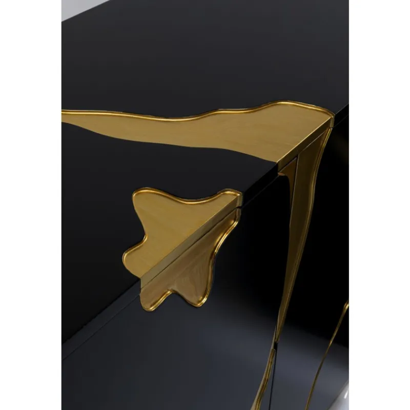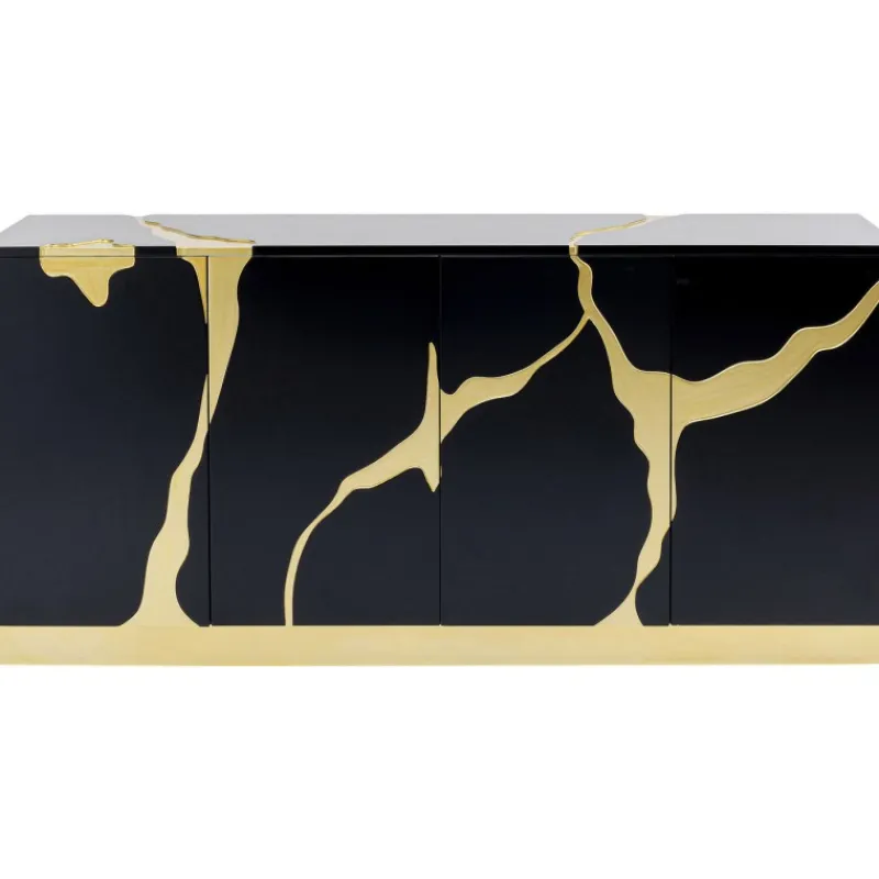 O aparador adicionará um certo toque à sua área de estar! Com o design único da base dourada e das linhas douradas, dá a impressão de que o revestimento preto recebeu um acabamento artístico. Absolutamente criativo e um grande ponto de atenção! O aparador de aspeto de luxo também pode ser utilizado como uma alternativa a uma placa de TV e oferece espaço de armazenamento suficiente com quatro prateleiras ajustáveis. A prática função de empurrar para abrir significa que pode abrir as portas sem a necessidade de puxadores, o que mantém o aspeto limpo e moderno do aparador. Aparador preto e dourado Design marcante com decoração fluida, serrilhada e lacada em ouro. Uma atualização atraente e luxuosa de mobiliário para a sua casa. Abertura conveniente com um leve toque graças à função de empurrar para abrir. Este artigo de mobiliário é fornecido montado.