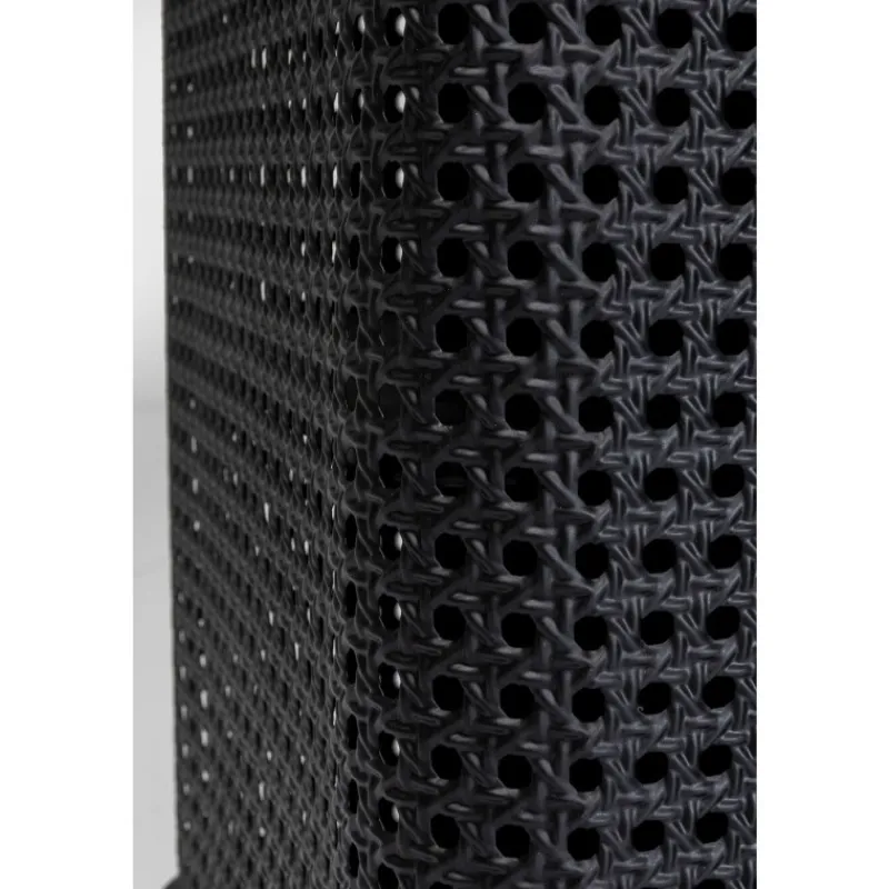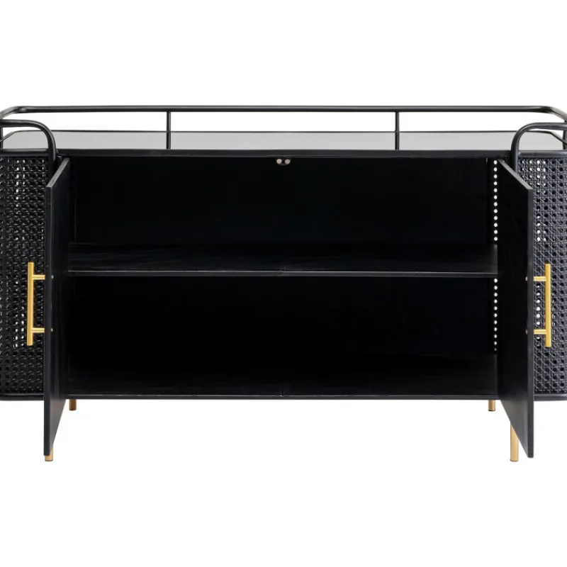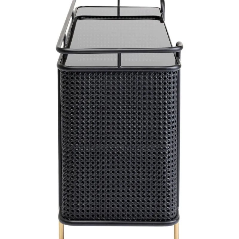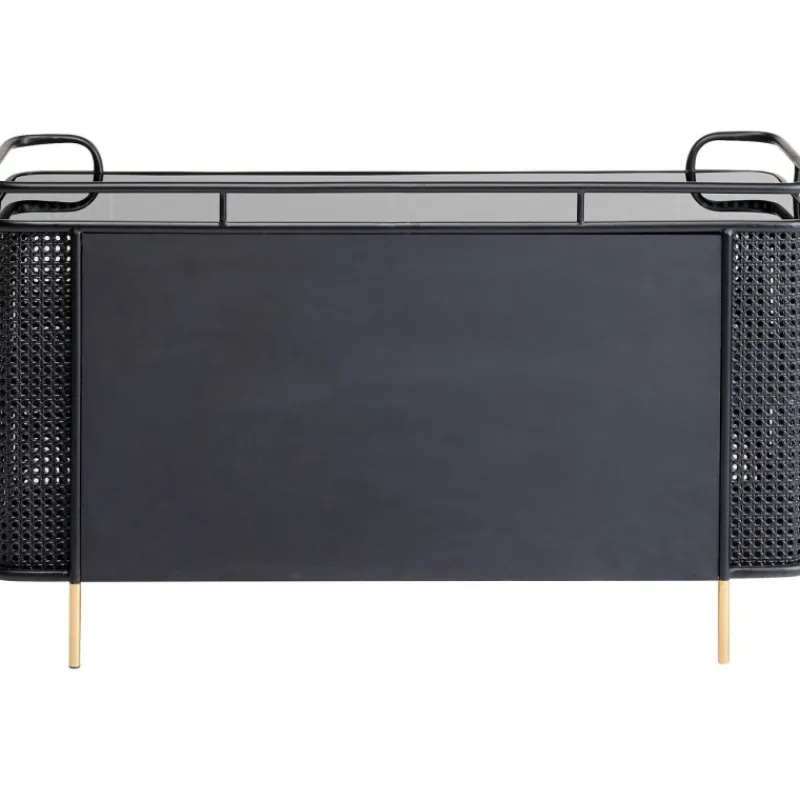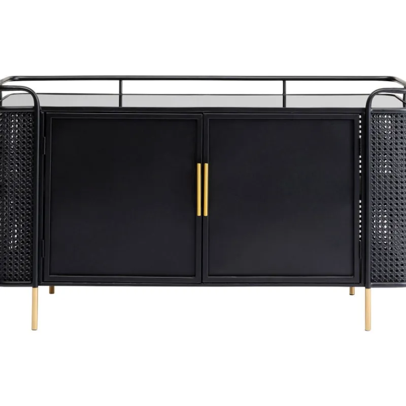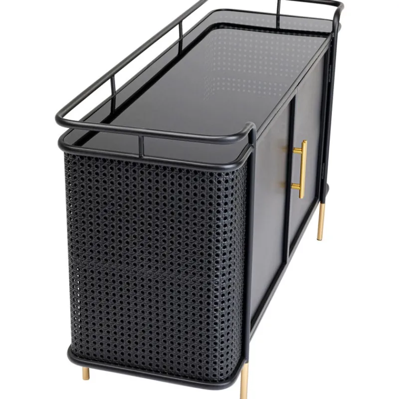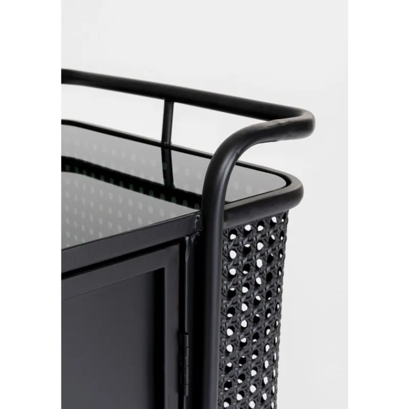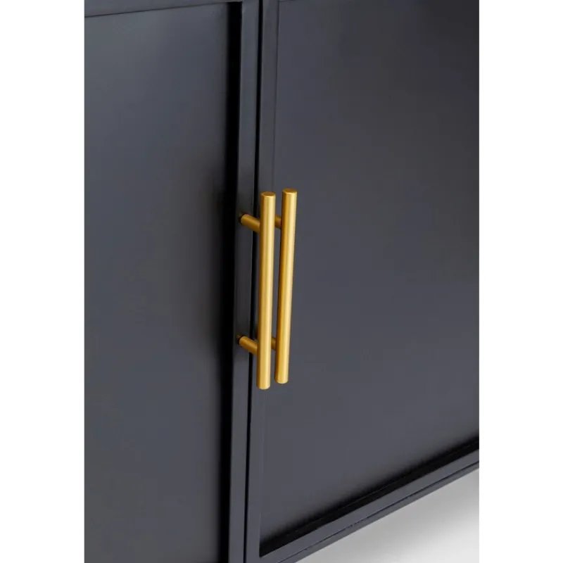A coleção de móveis Fence expande os mundos do estilo de móveis de aço. Não é o visual industrial tradicionalmente robusto, mas a elegância moderna que faz a Fence destacar-se. O elemento surpresa é fornecido por três ingredientes que são novos para móveis de oficina. A malha vienense é destaque nas frentes e lados. As superfícies lisas de aço lacado e vidro alternam com secções dum visual de vime, que também são feitas de aço. O design da coleção Fence também é inconfundível graças às linhas elegantes das pernas e estruturas, que terminam numa espécie de grade, semelhante ao corrimão em redor do convés de um navio. Para arredondar tudo, alças e pernas com acabamento em latão proporcionam momentos retro elegantes. Aparador de metal preto com pés e alças dourados, medindo 70 x 120 x 40 cm (A/L/P). Móveis de aço com um toque elegante são característicos do novo estilo loft. O mobiliário de aço funciona como uma peça de design, uma solução de arrumação sofisticada e como um armário de TV. A malha vienense feita de metal nos lados dá ao aparador uma aparência de alta classe e um estilo muito individual. A parte superior feita de vidro de segurança temperado colorido torna esta peça de mobiliário de sala de estar particularmente fácil de limpar.