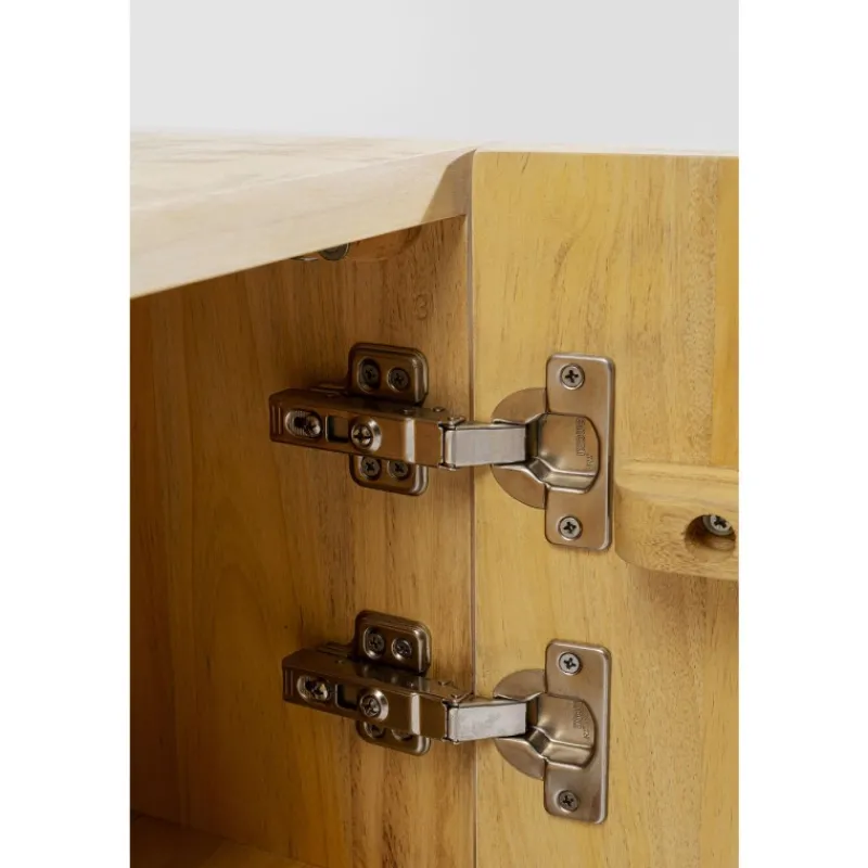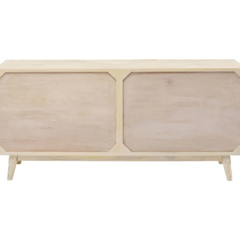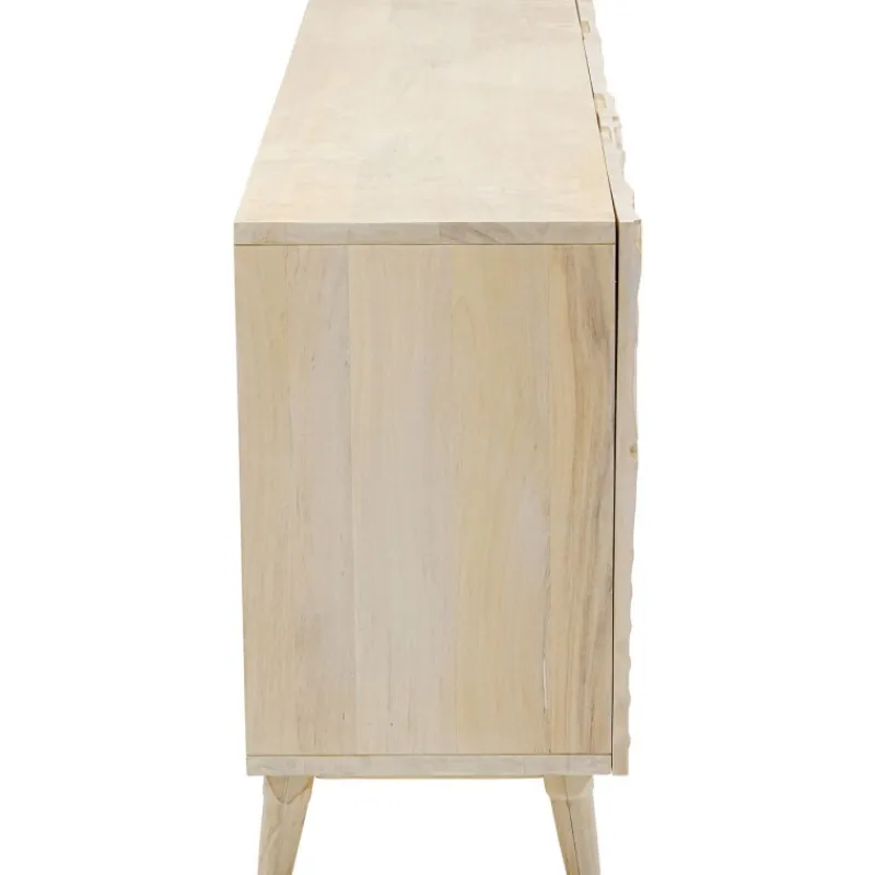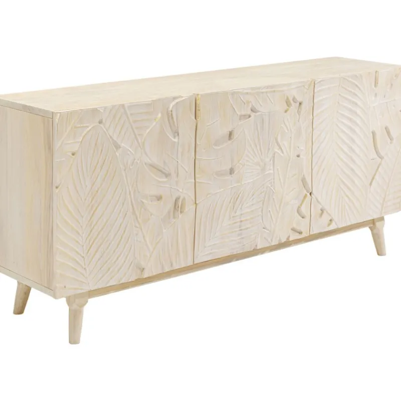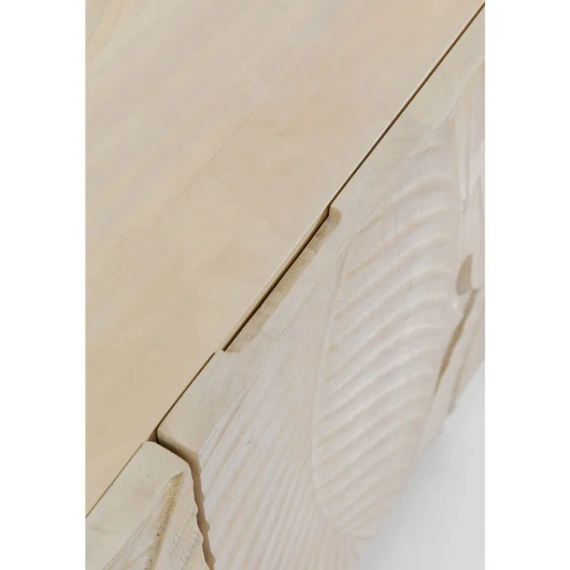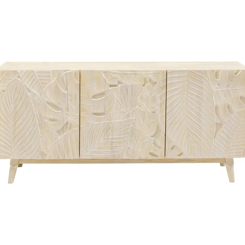 Este bonito aparador em madeira maciça de cor clara é perfeito para os amantes de um estilo interior natural. A frente tridimensional do aparador é decorada com motivos artísticos de folhas, que dão um toque vibrante a este móvel. Com 3 compartimentos grandes, oferece muito espaço de armazenamento para todas as suas peças. Este aparador é intemporal e integra-se harmoniosamente em qualquer interior. É um belo artigo de mobiliário para quem valoriza um design excecional e funcional. Por ser feito em madeira maciça, exceto o painel traseiro, este aparador proporcionar-lhe-á muitos anos de serviço. E, mesmo no final de sua vida útil, a madeira pode ser facilmente devolvida ao ciclo de reciclagem. Aparador feito de madeira maciça de cor clara, 75 x 160 x 58 cm (A/L/P). Uma cómoda atraente com um frente esculpida para um aspeto de selva urbana. Feito à mão em madeira de olmo. Uma solução de armazenamento única na sala de estar ou no quarto com uma prateleira fixa por compartimento. As portas fecham suavemente graças à função de fecho suave e as dobradiças são ajustáveis.