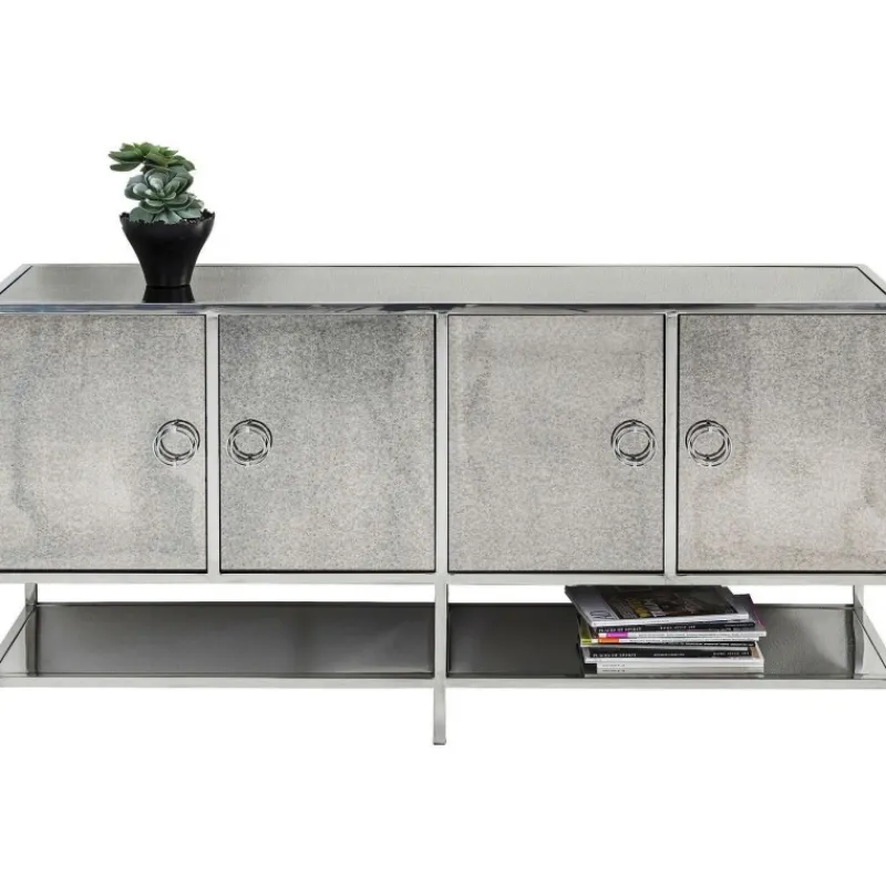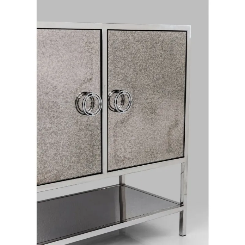 Sofisticação moderna. Este aparador da colecção Moonscape provoca um impacto com uma combinação única de formas claramente definidas, detalhes requintados e aspecto monocromático. Aço inoxidável brilhante e vidro espelhado cinzento com um visual antigo dão-lhe um toque místico e glamoroso. Os puxadores circulares das portas completam com sucesso o visual. O generoso espaço de arrumação está escondido dentro das quatro portas.