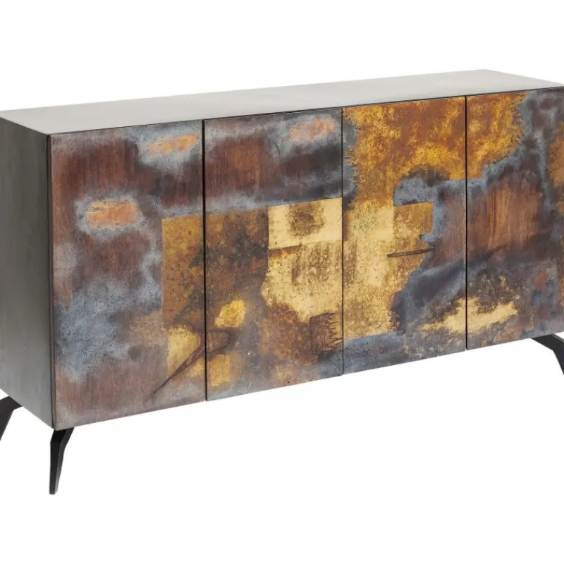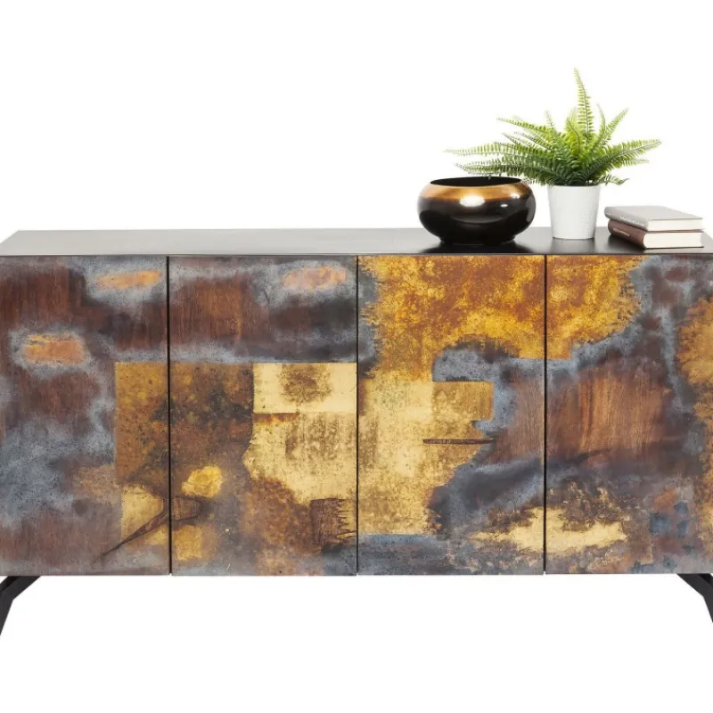 Um Aparador no estilo industrial, que como exemplar único tem um carácter muito próprio devido às frentes das portas artisticamente desenhadas à mão Um corpo metálico com portas de madeira, que mostram um empolgante gradiente de cor. Um amigo para a vida: a linguagem de design intemporal e as cores quentes garantem conforto O que é prático também pode ter estilo: muitas coisas podem ser guardadas aqui. O Oxy também é atraente como um móvel TV invulgar Uma peça que pode ser facilmente combinada com peças em madeira.