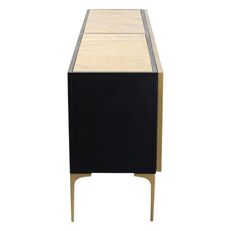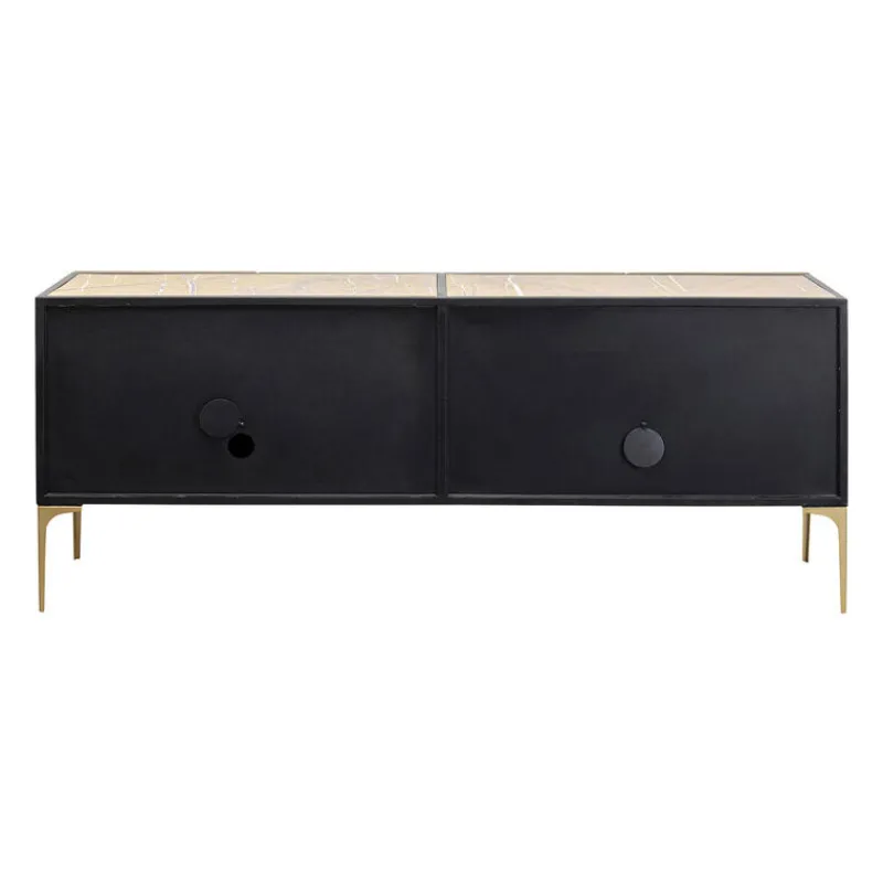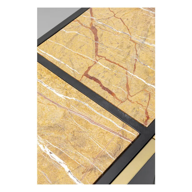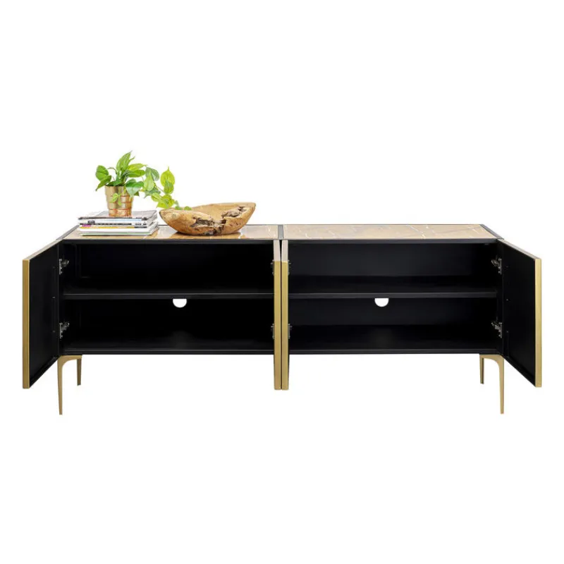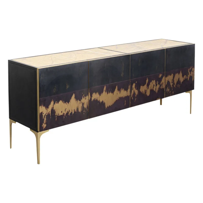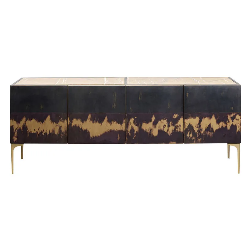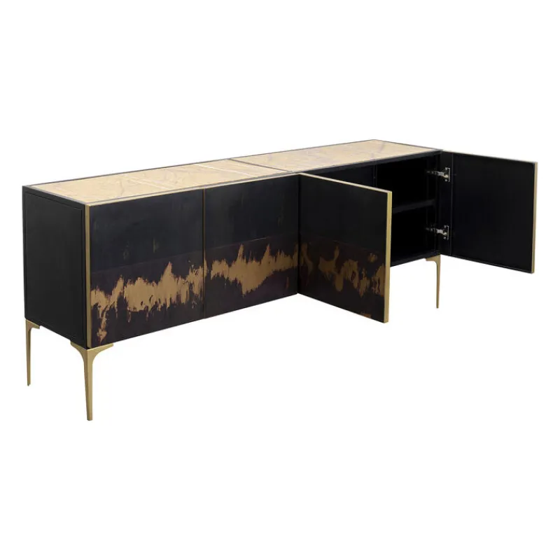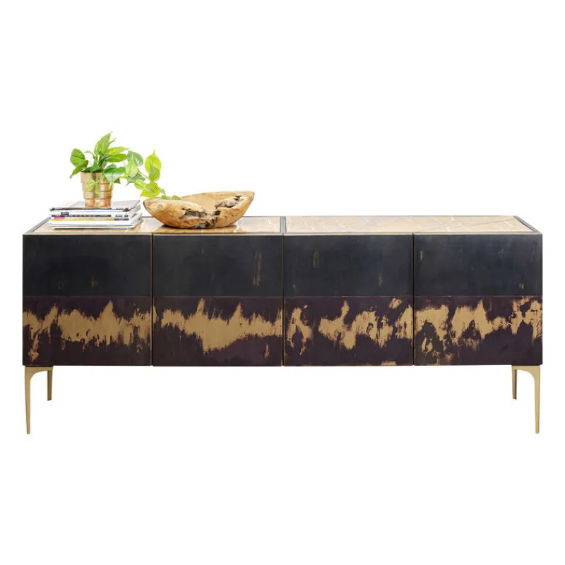 Este aparador de metal foi disfarçado como uma obra de arte abstrata. Cada frente é criada utilizando uma técnica especial e a sua peça única é única. O corpo metálico é coberto por um tampo luxuoso e muito atrativo feito de mármore claro e verdadeiro. Com uma largura de 168 cm, o aparador de design do nosso KARE Studio tem quatro portas que podem ser abertas e fechadas com um ligeiro empurrão. Atrás delas, há espaço para o bar da casa ou para a tecnologia de entretenimento para televisão e música. As práticas saídas de cabos na parte de trás facilitam muito a instalação.