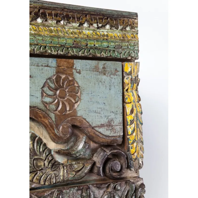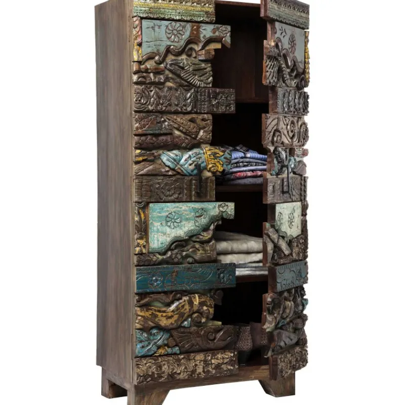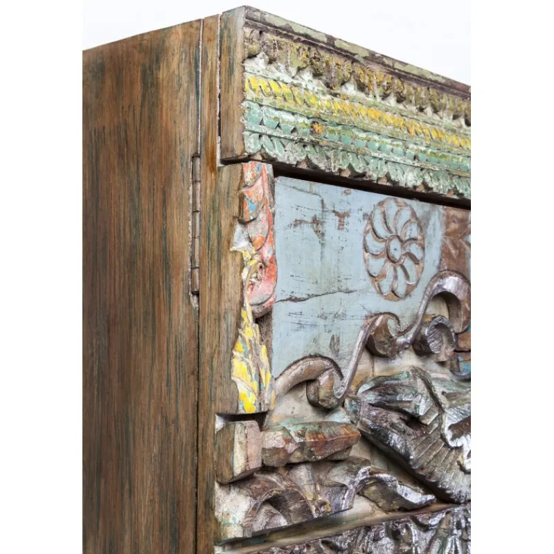 Armário: imaginativo e simbólico. São os detalhes que dão vida às coisas. Como uma parede ricamente decorada com motivos e ornamentos esculpidos com imaginação – esta é a impressão criada por este magnífico e místico armário da colecção KARE Shanti. Com muita imaginação, esta peça narra histórias de contos de fadas sobre tesouros escondidos, profecias e um romantismo que é retratado em toda a sua beleza. No trilho destes puzzles poderá descobrir detalhes notáveis, tais como ornamentos e motivos florais. Shanti Surprise fascina uma e outra vez e transmite uma verdadeira joie de vivre. A colecção Shanti conta a história da arte centenária de esculpir na Índia. A nossa equipa de design desenvolveu a ideia de como criar frentes de mobiliário a partir de peças de puzzle directamente no local, na oficina. Trabalhamos deliberadamente com as formas rudes e originais, para que a história deste artesanato seja levada com autenticidade aos dias de hoje e o seu encanto e a sua aura única sejam preservados. Disponível também como cómoda. Cuidados a ter: Para superfícies em relevo feitas de madeira, uma escova macia é adequada para remover o pó das ranhuras. Ocasionalmente, aspire cuidadosamente com uma escova macia.