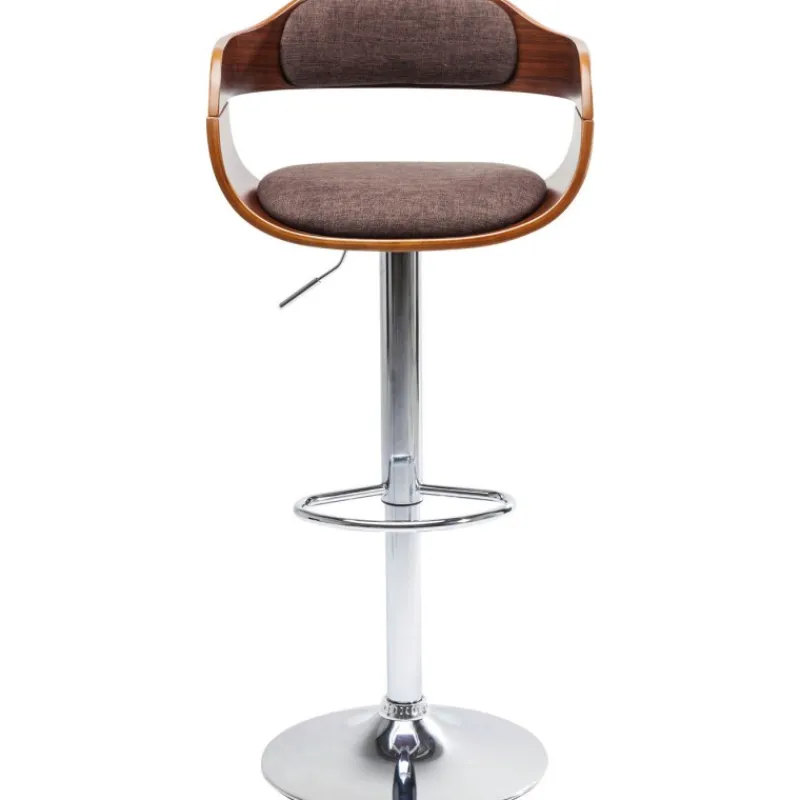 Este elegante banco de bar causa impacto com o seu fino encanto retro e design elegante. As harmoniosas cores, o curvo do assento com folha de madeira e a base metálica cromada e brilhante tornam esta cadeira particularmente atractiva. Um leve estofo no assento e encosto e práticos apoios para os pés proporcionam conforto. A altura do assento pode ser ajustada individualmente através de um elevador a gás. Ideal para cozinha e bar. Outras versões disponíveis.