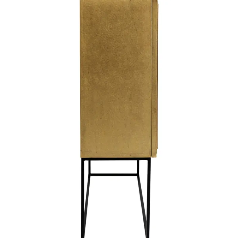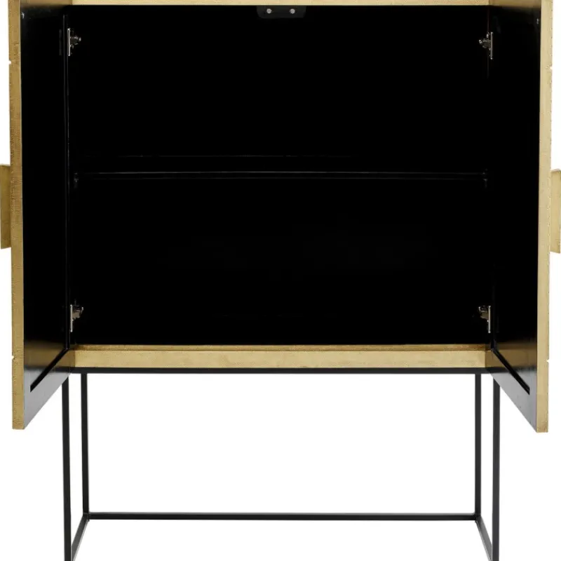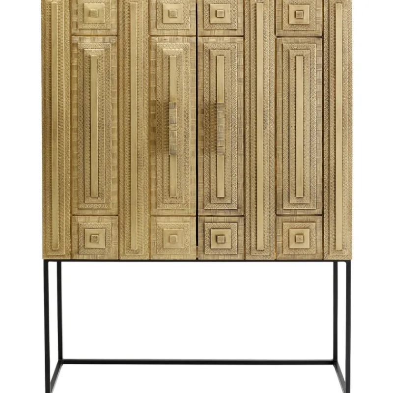 Capacidade máxima de carga: 15 kg. Entregue desmontado. Manutenção: limpe os móveis regularmente com um pano limpo, macio e sem fios. Lembre-se de trocar o pano regularmente, porque os tecidos sujos podem arranhar a superfície dos móveis. Também pode usar um verniz transparente para móveis quando a madeira começar a perder o brilho. Um armário com pernas altas – isso, em si, já é um fenómeno excecional. O Marrakesh também é excecional nos detalhes: desde a base preta simples até ao corpo que brilha discretamente em ouro. Mas o que é realmente impressionante são as frentes das duas grandes portas com o seu jogo decorativo de formas geométricas e padrões delicados. O Marrakesh faz sonhar com quartos de contos de fadas, como os das Mil e Uma Noites. Ou talvez com a nova peça central para a parede da sala de estar.