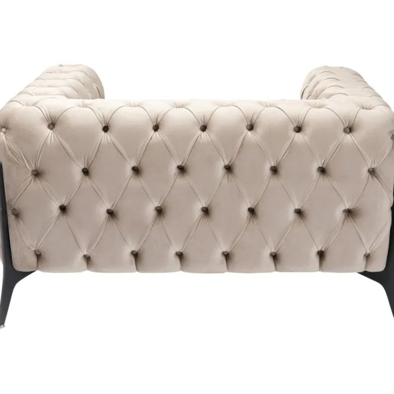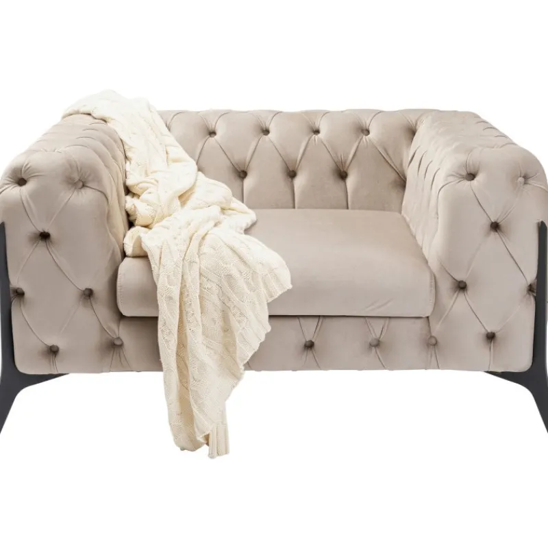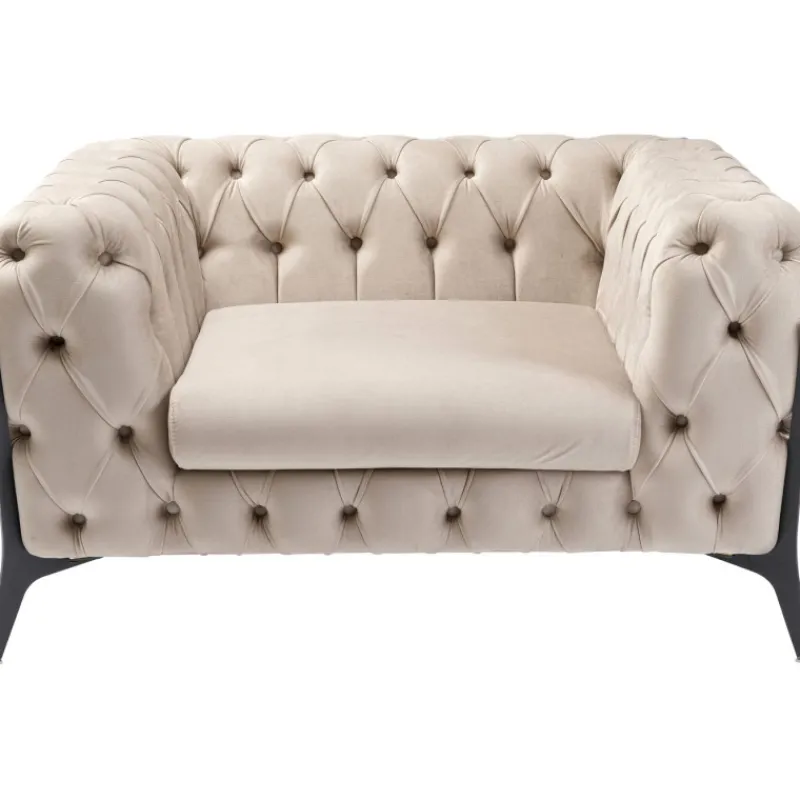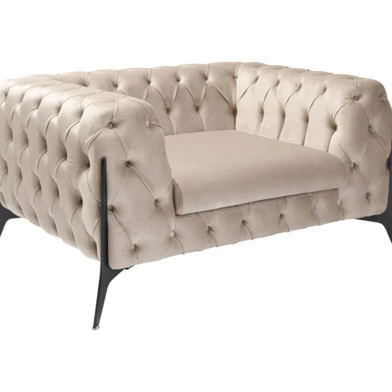 Experimente conforto de primeira classe e design excepcional com a cadeira de braços Bellissima da KARE. O design clássico recebe uma atualização moderna com o estilo especial da estrutura e das pernas. A cobertura macia com o seu visual elegante de veludo, juntamente com a costura de botão, criam uma estética única. A largura desta cadeira aveludada com o seu assento de corpo inteiro merece um destaque. A cadeira é uma peça perfeita para qualquer sala e adicionará um toque especial à sua casa. O acabamento de alta qualidade e o design robusto garantem uma longa vida útil e um conforto duradouro. Relaxe em estilo e com facilidade e expresse o seu encanto pessoal com a nossa cadeira de braços KARE. Cadeira Chesterfield em bege, 70 x 120 x 95 cm (A/L/P). A suspensão de cinta elástica e o acolchoamento de espuma garantem grande conforto de assento. Corpo de madeira sólida e pernas pretas estáveis feitas de aço lacado. O tecido de cobertura de poliéster com o seu visual de veludo é macio ao toque. A altura do assento de 42 cm é ideal para relaxar.