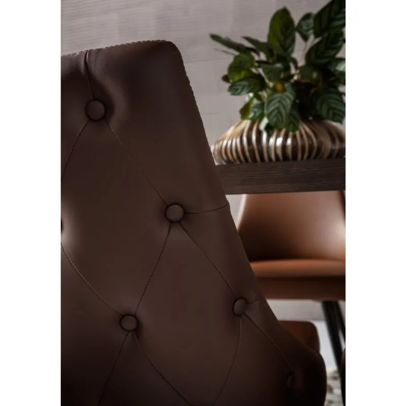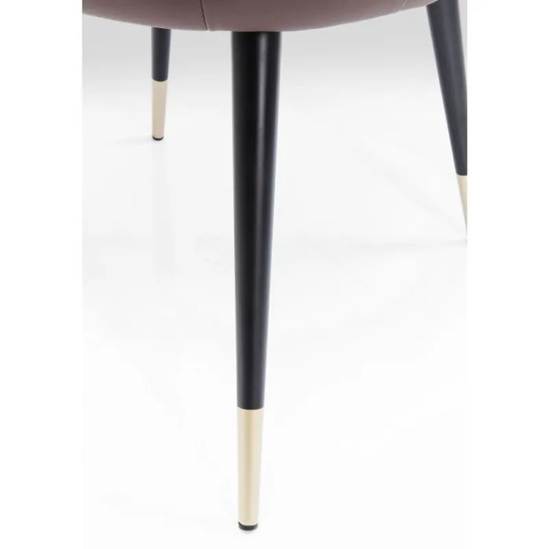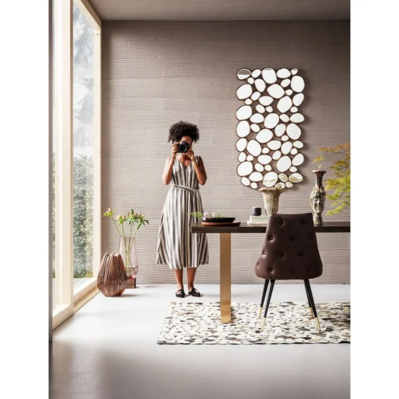 Confortável? Sim! Elegante? Sim novamente! Uma cadeira de jantar ao estilo dos anos 50, com estofos suave. Pernas finas com muitos detalhes como pés dourados e botões Chesterfield na parte de trás. Parece tão decorativo como uma cadeira de cocktail e será certamente um lugar acolhedor para as suas pessoas preferidas em muitos jantares.
