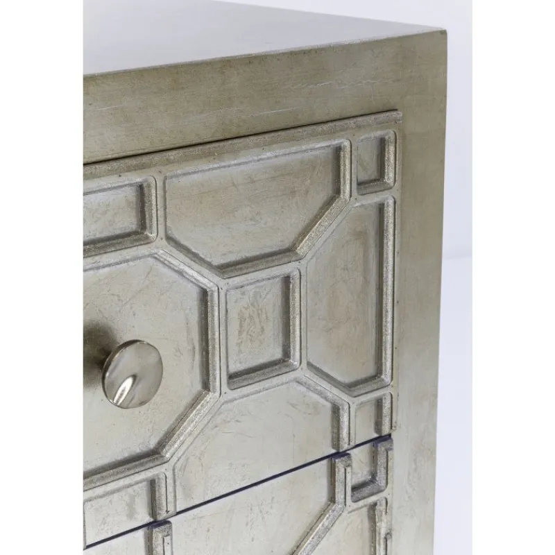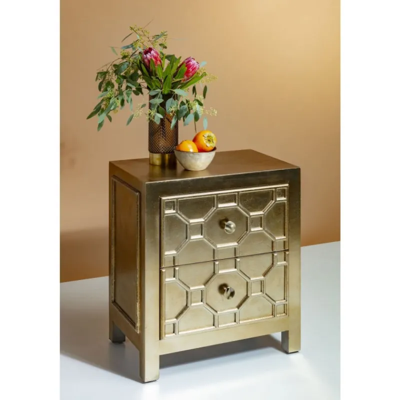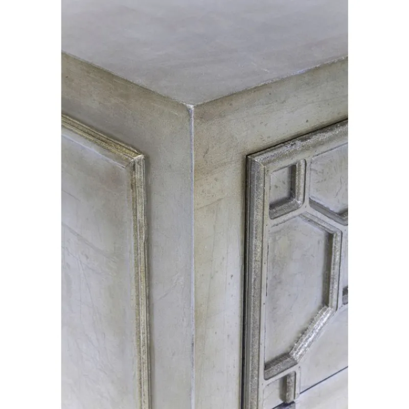Uma homenagem à decoração. Esta mesinha de cabeceira da colecção Alhambra fascina com os sublimes motivos de inspiração muçulmana. O seu visual é refinado por um acabamento exclusivo em prateado mate. Duas gavetas.