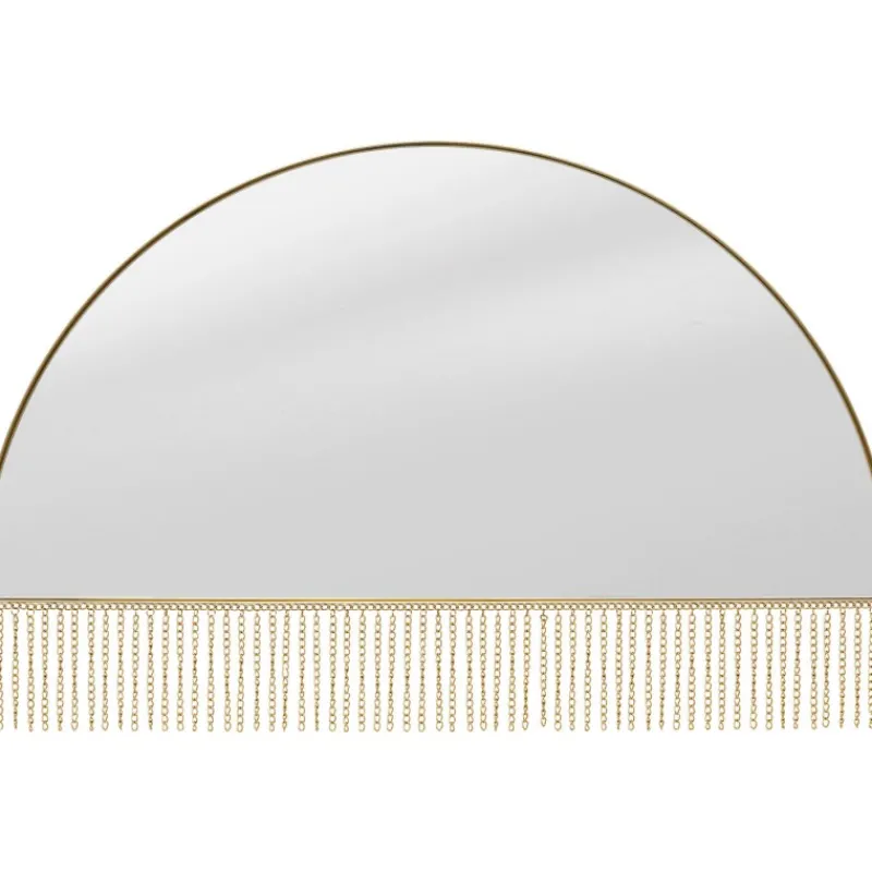 O espelho de parede Opera Half é uma peça de design impressionante e criativa para interiores modernos. A estrutura semicircular feita de aço com acabamento em latão e as correntes de metal dourado dão ao espelho um toque estético individual. Cada peça é feita à mão e, portanto, única. O espelho tem uma superfície refletora de 109×69 cm e é montado horizontalmente na parede. Esta decoração de parede trará luz para a sua sala de estar, quarto ou corredor e é a ornamentação que melhora elegantemente qualquer sala. Espelho de parede de metal dourado, 110 x 70 x 3 cm (A/P/D). Um espelho semicircular com franjas feitas de correntes de metal fino. A estrutura de aço resistente é revestida com latão cintilante. Feito à mão. Uma decoração de parede moderna com um toque fascinante e divertido.