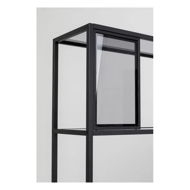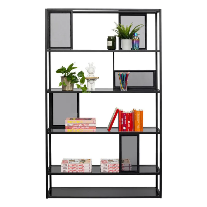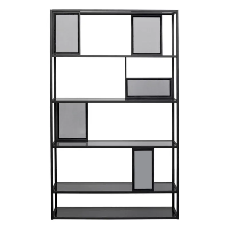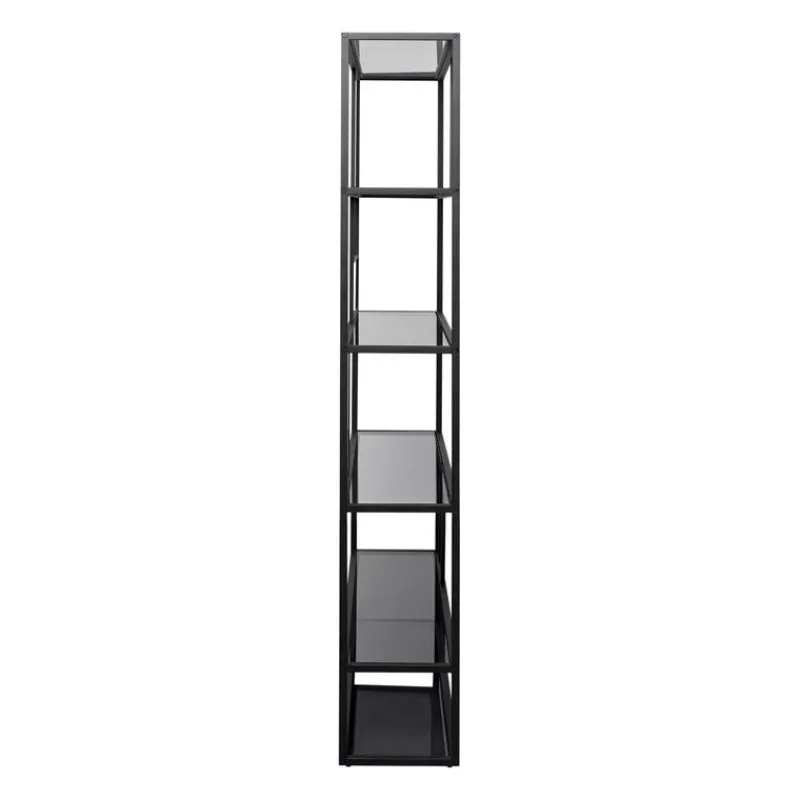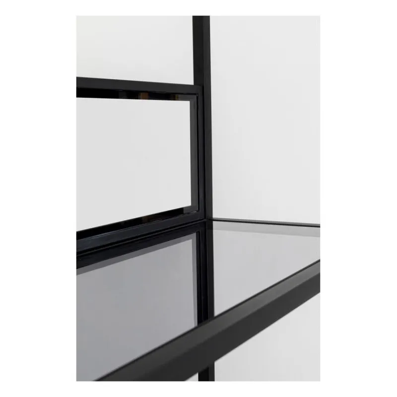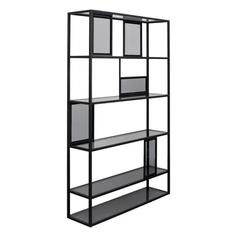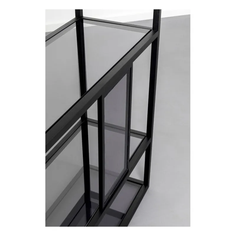 Com a sua estrutura em aço e as frentes em vidro fumado, esta moderna estante fica bem em qualquer interior. Sem costas, pode ser utilizada como divisória de espaços.
