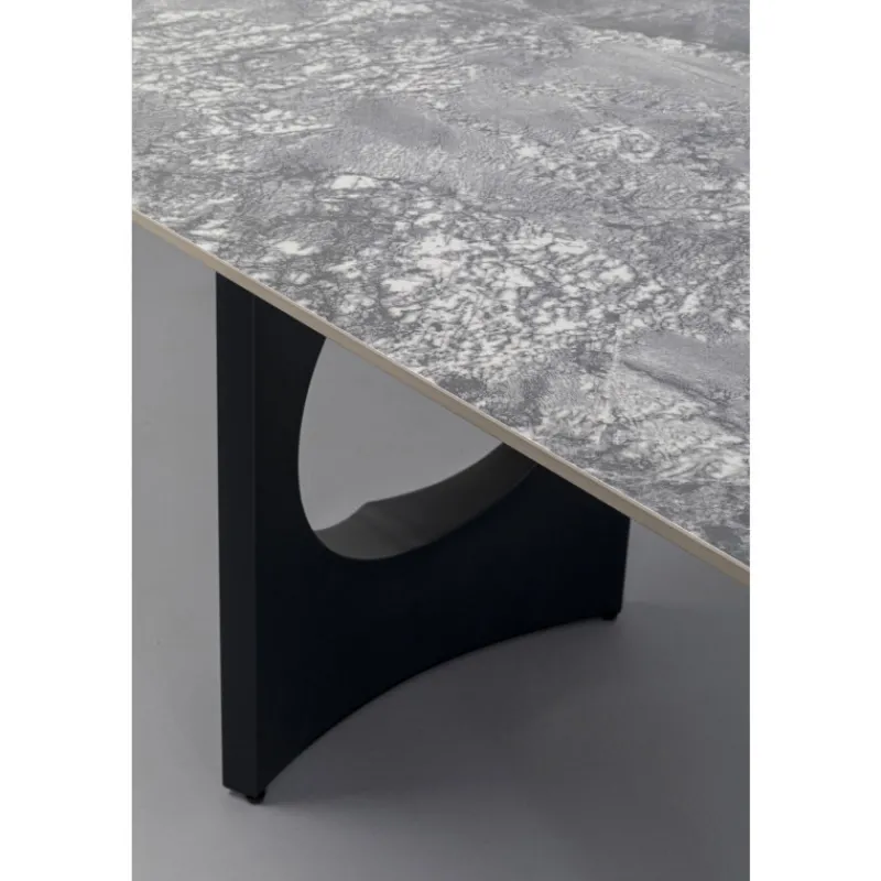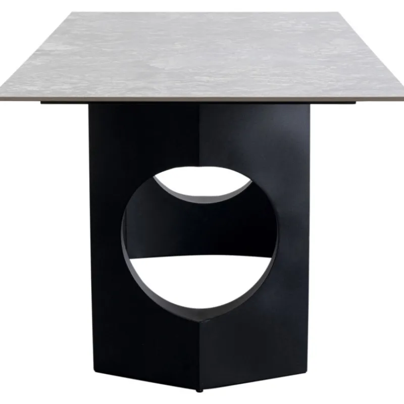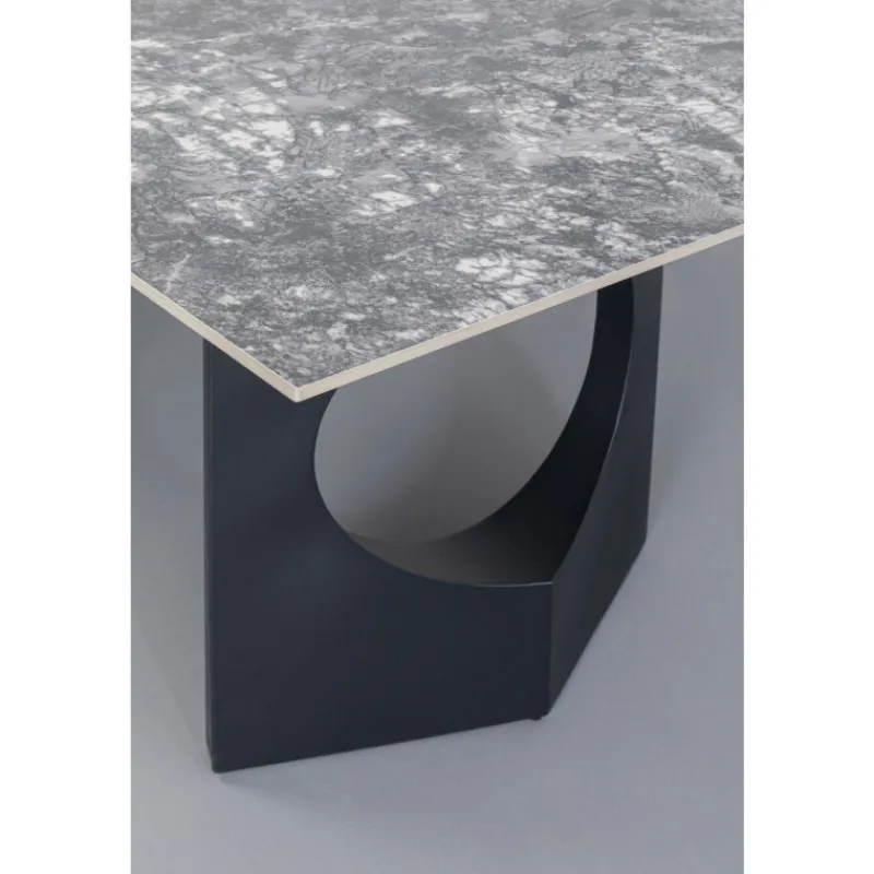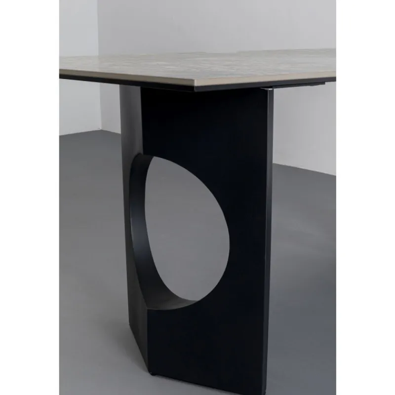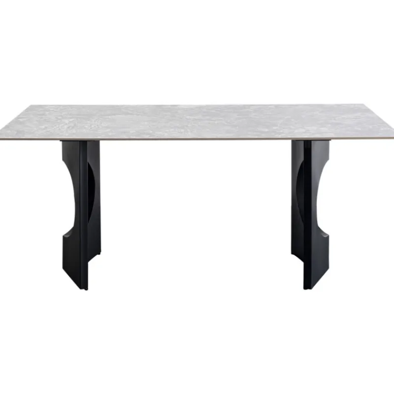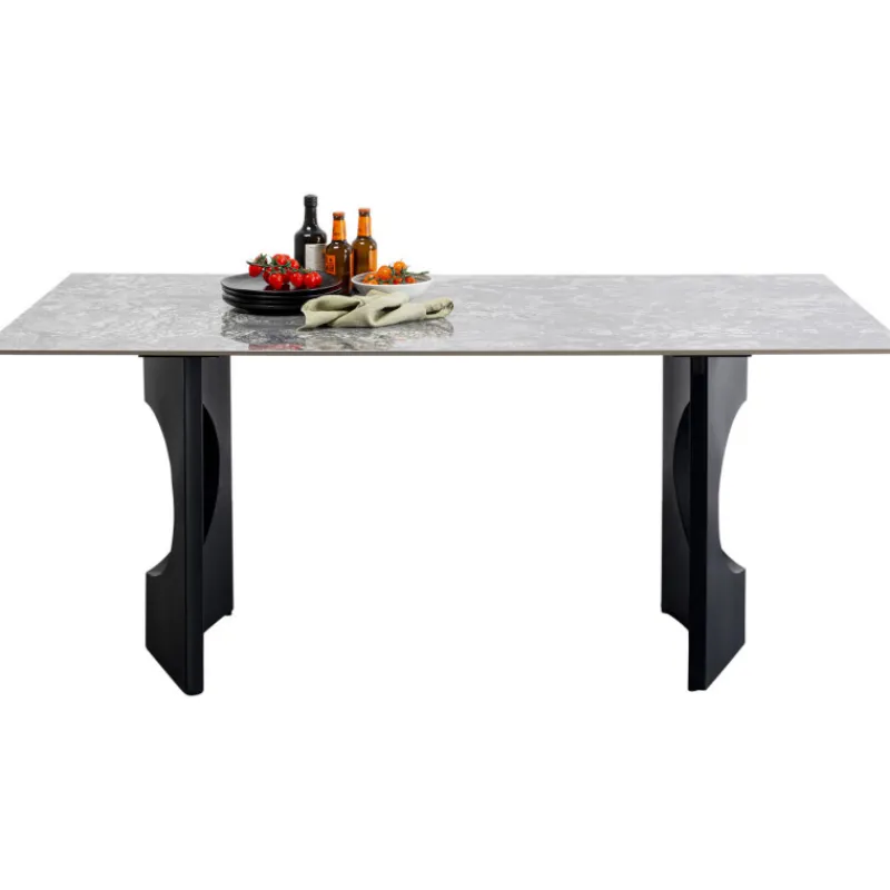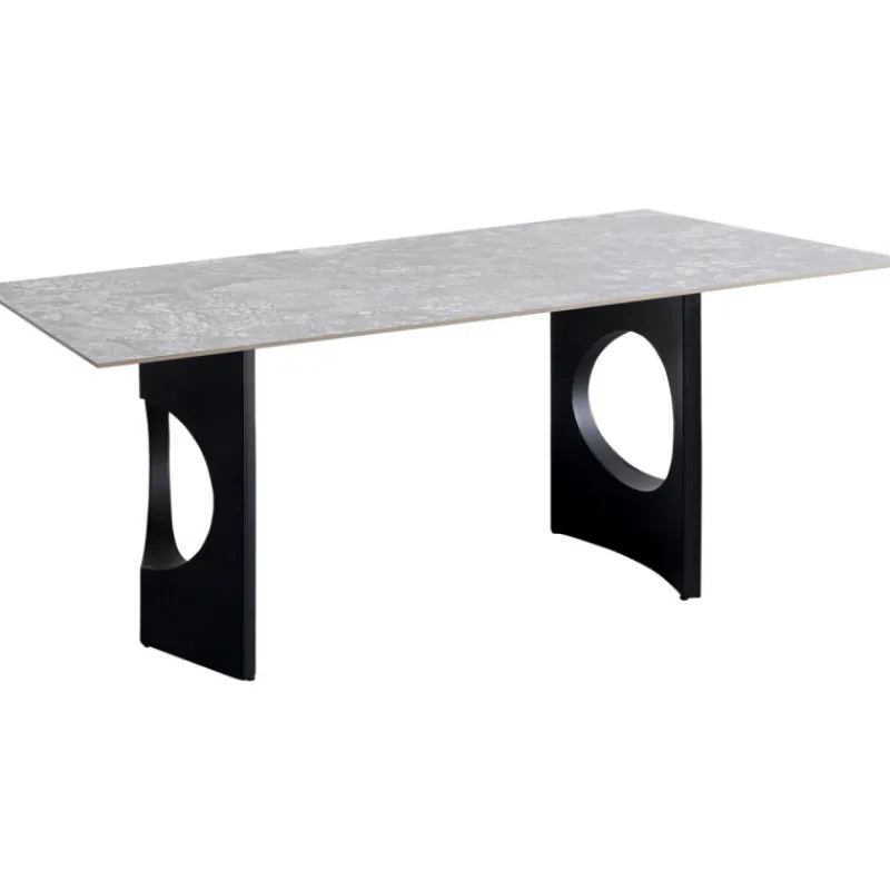 Esta mesa de jantar retangular contemporânea chama a atenção com o seu tampo em grés cinzento e branco montado em pernas de aço pretas com uma silhueta atípica. O tampo de 180×90 cm é perfeito para 6 pessoas comerem à volta.