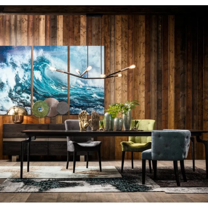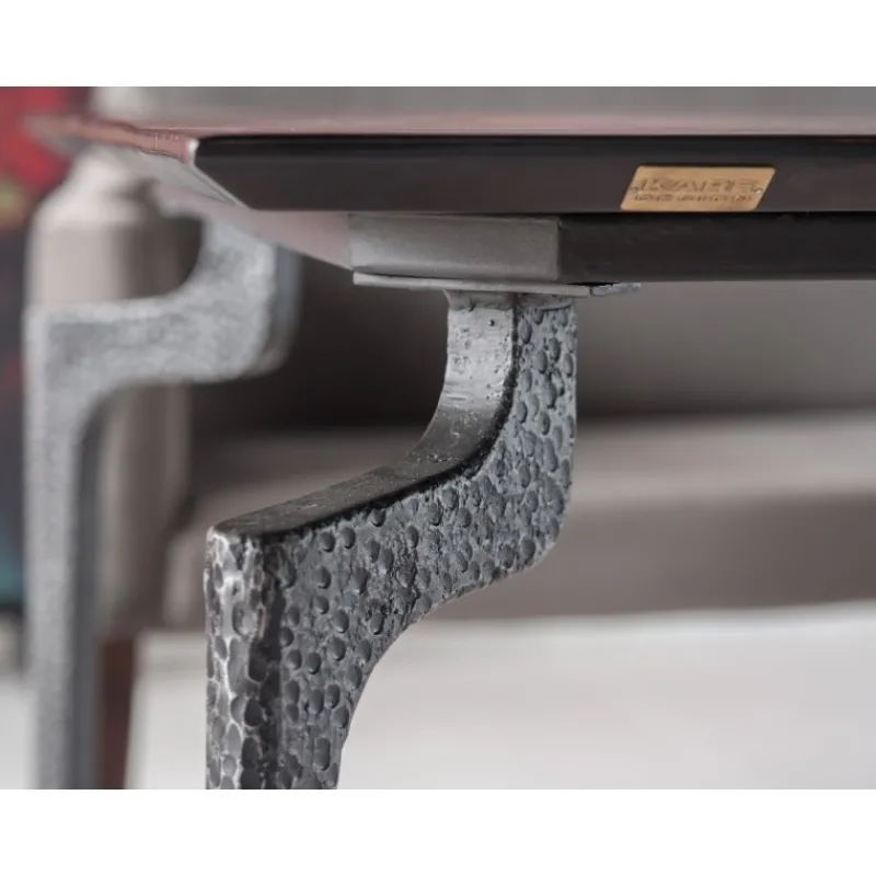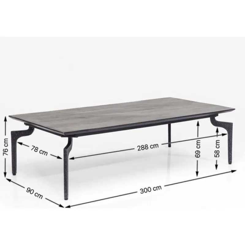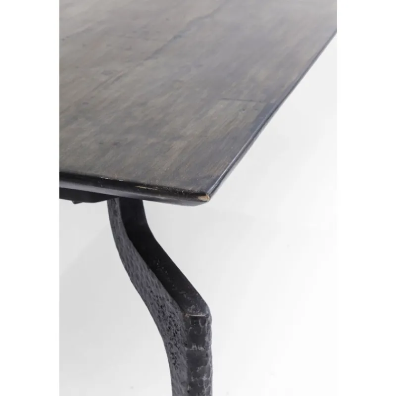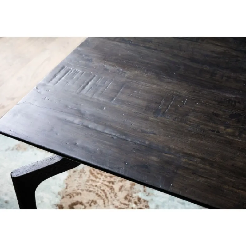 Mesa de refeições rectangular, muito grande, feita em madeira maciça reciclada e pintada com pés em aço lacado e feitos à mão. Para 8-12 pessoas. As pernas em aço, engenhosamente moldadas e marteladas, os cantos arredondados da mesa e a estrutura viva do tampo de madeira reciclada, são todos únicos. Se na sala de jantar ou na cozinha: a mesa em madeira maciça escura, tem um encanto refinado e intemporal e, graças às suas pernas em aço, cria um efeito maravilhosamente airoso na sala. Uma mesa de refeições em madeira bonita e robusta num estilo sem adornos, que se adapta perfeitamente a qualquer estilo de mobiliário e oferece muito espaço. Disponível noutros tamanhos.