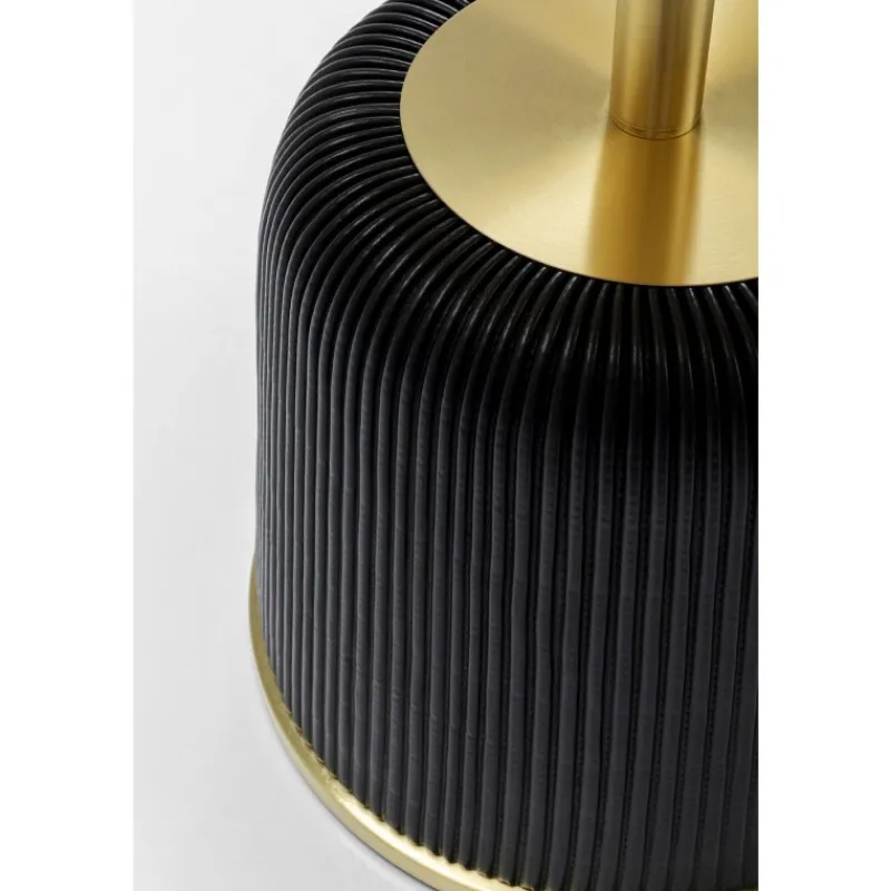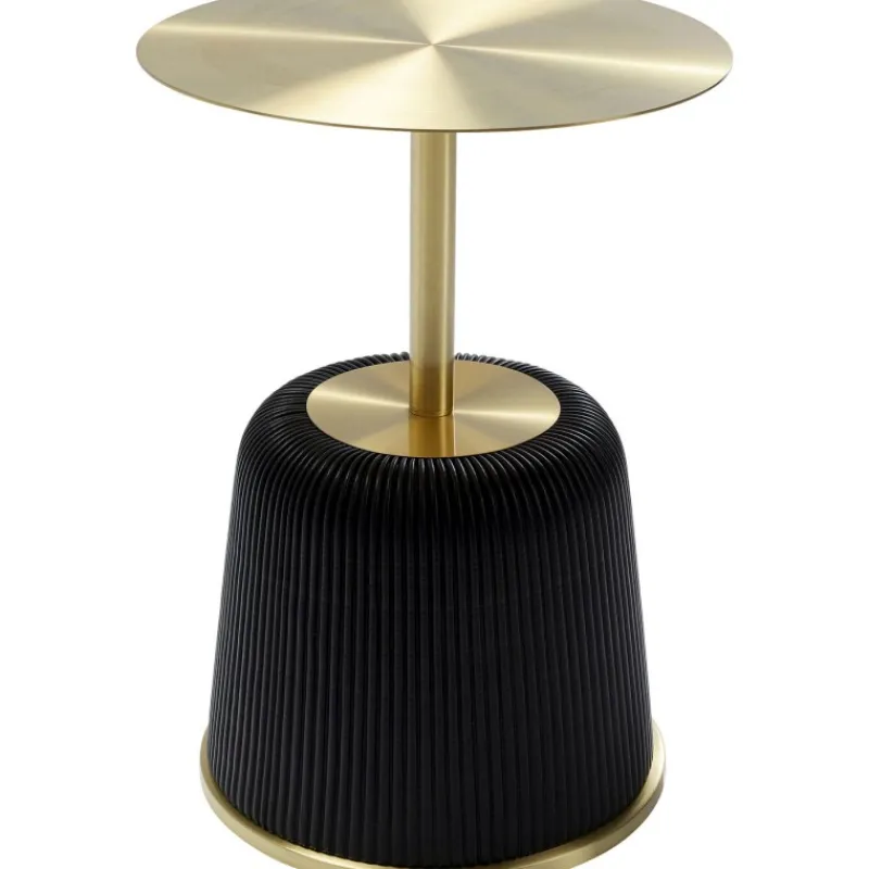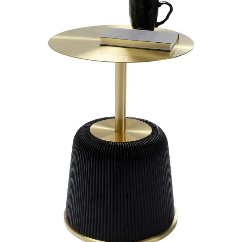 Uma peça marcante para qualquer interior contemporâneo: esta mesa redonda combina linhas limpas com um design incomum. O estilo glamoroso é enfatizado pelo cetim cintilante, pelo tampo de mesa de metal dourado e pela estrutura dourada. A base canelada incomum é especialmente atraente. Isto proporciona estabilidade e uma sensação agradável. Esta pequena mesa é ideal como peça central elegante para a sala de estar ou quarto. É feita de metal de alta qualidade e, portanto, não oferece apenas uma aparência atraente, mas também uma longa vida útil. Mesa de apoio redonda em preto e dourado, 55 x 40 x 40 cm (A/L/P). O tampo da mesa e a estrutura são feitos de aço com acabamento acetinado. A base distinta tem uma capa acolchoada e canelada. Feita à mão. Uma mesa de sala de estar para qualquer estilo de mobiliário moderno e elegante.