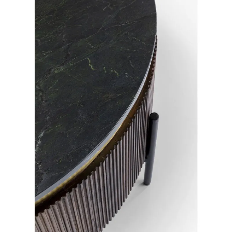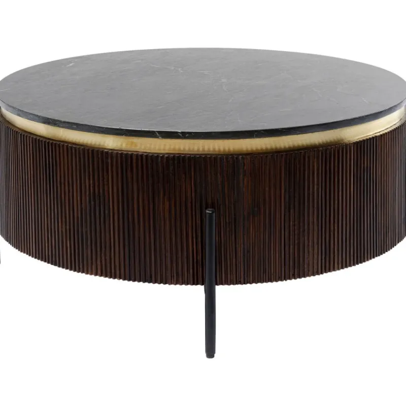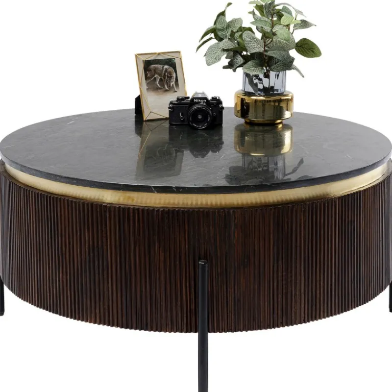 Moderna e elegante com um toque de extravagância – estas características resumem muito bem a mesa de centro escura. Esta peça de mobiliário é definitivamente um investimento a longo prazo, porque o mobiliário de madeira é conhecido por ser durável. Apenas materiais de primeira classe são usados para criar esta joia: lacado escuro, madeira de manga sólida, aço para as pernas, uma guarnição de latão e mármore mineral para o tampo. Os profissionais de design de interiores sabem que a interação de diferentes superfícies faz com que os quartos pareçam particularmente vibrantes. No caso desta mesa de centro, o metal de latão, a pedra do tampo e o corpo decorado com ripas finas criam uma tríade visualmente harmoniosa. Com esta mesa redonda, adicionará um charme muito especial à sua sala de estar. Uma mesa redonda feita de madeira maciça com um tampo de mármore (mármore mineral). Design elegante com uma faixa feita de latão escovado e painéis estruturados. Uma companheira elegante e com estilo para o seu sofá na sala de estar. Feita de materiais duráveis e recicláveis. Fornecida totalmente montada.