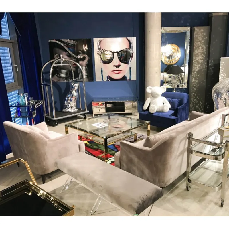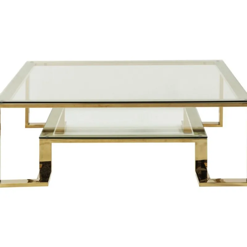 Elegante mesa de centro com formas perfeitas e encanto glamoroso. Um visual requintado e luxuoso com duas prateleiras em vidro. O design é moderno e, graças ao seu aspecto dourado, extremamente elegante.