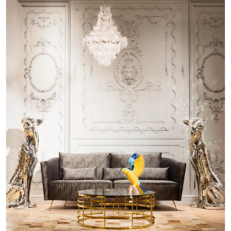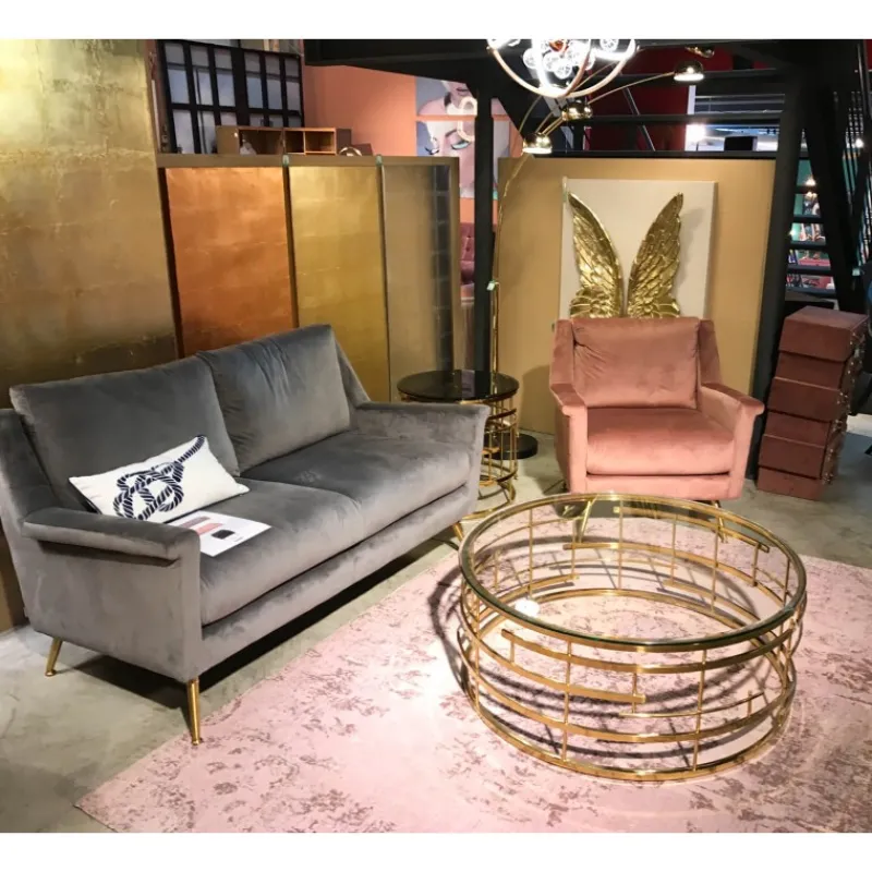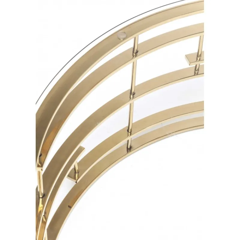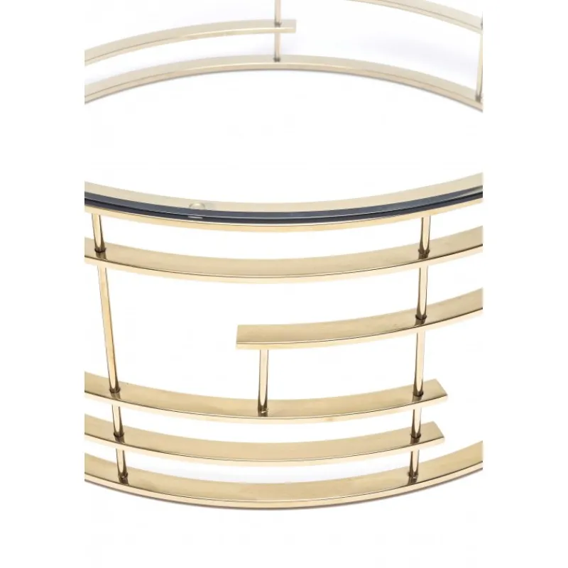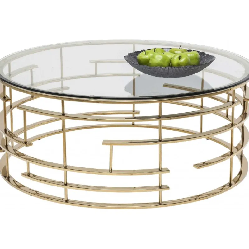 Mesa de centro: uma mesa moderna e futurista em vidro com base em aço inoxidável de cor dourada. O tampo redondo e transparente da mesa é em vidro temperado. Esta mesa de centro é particularmente adequada para interiores modernos.