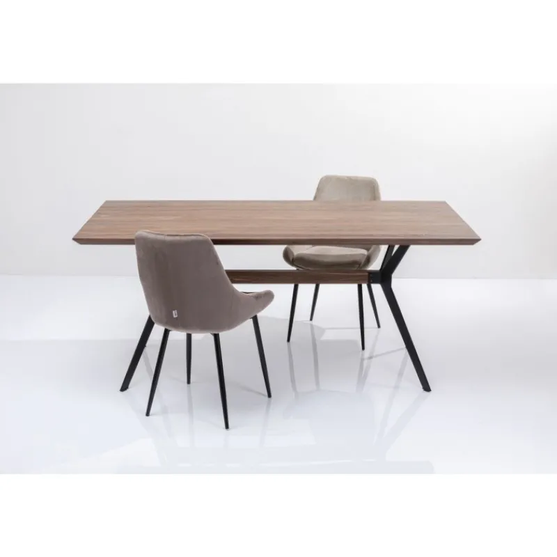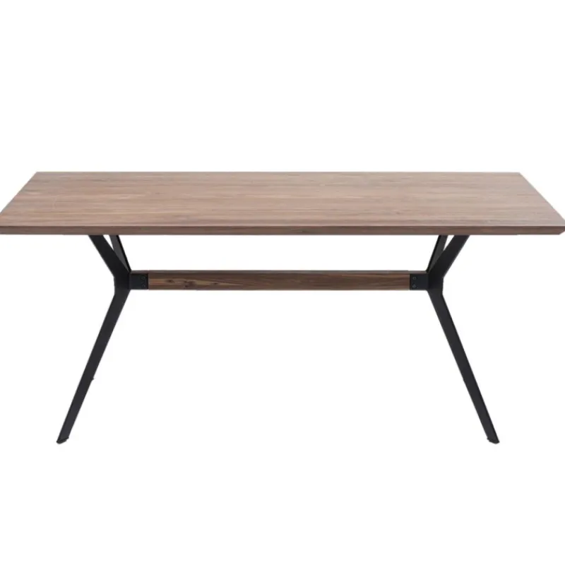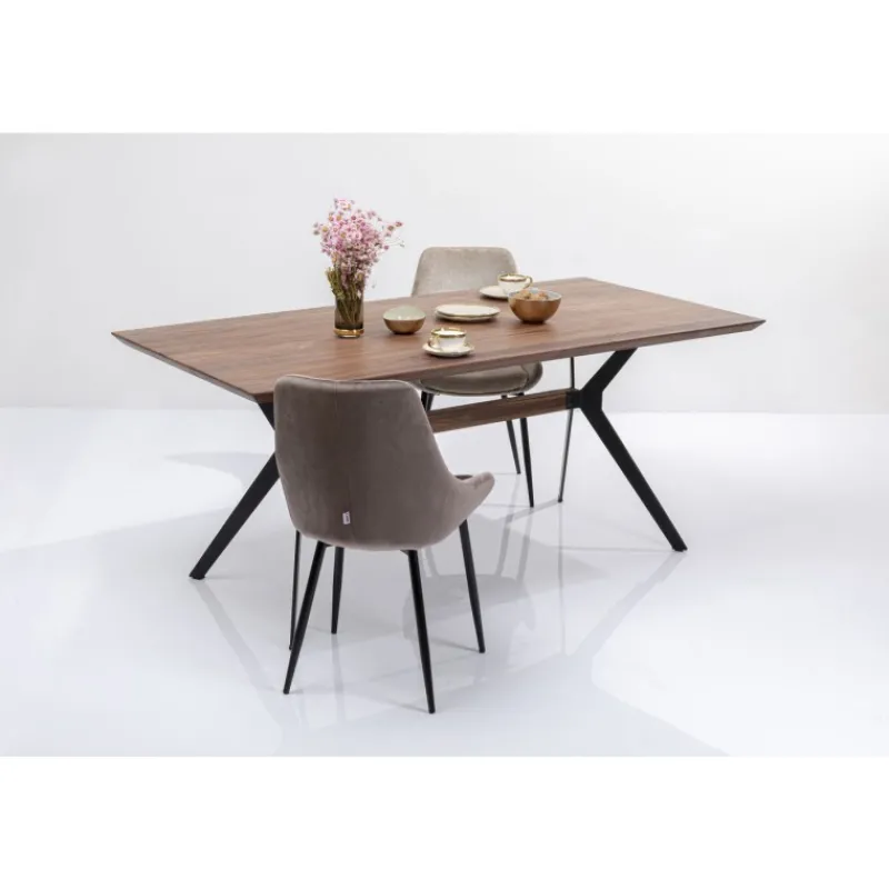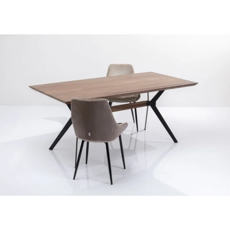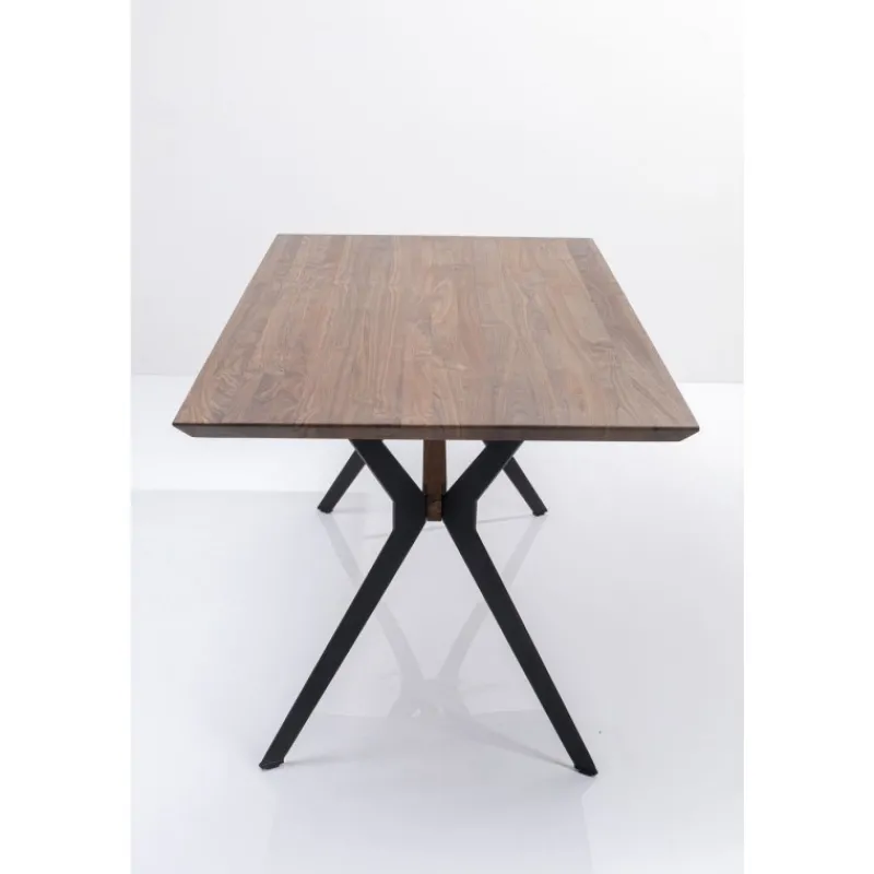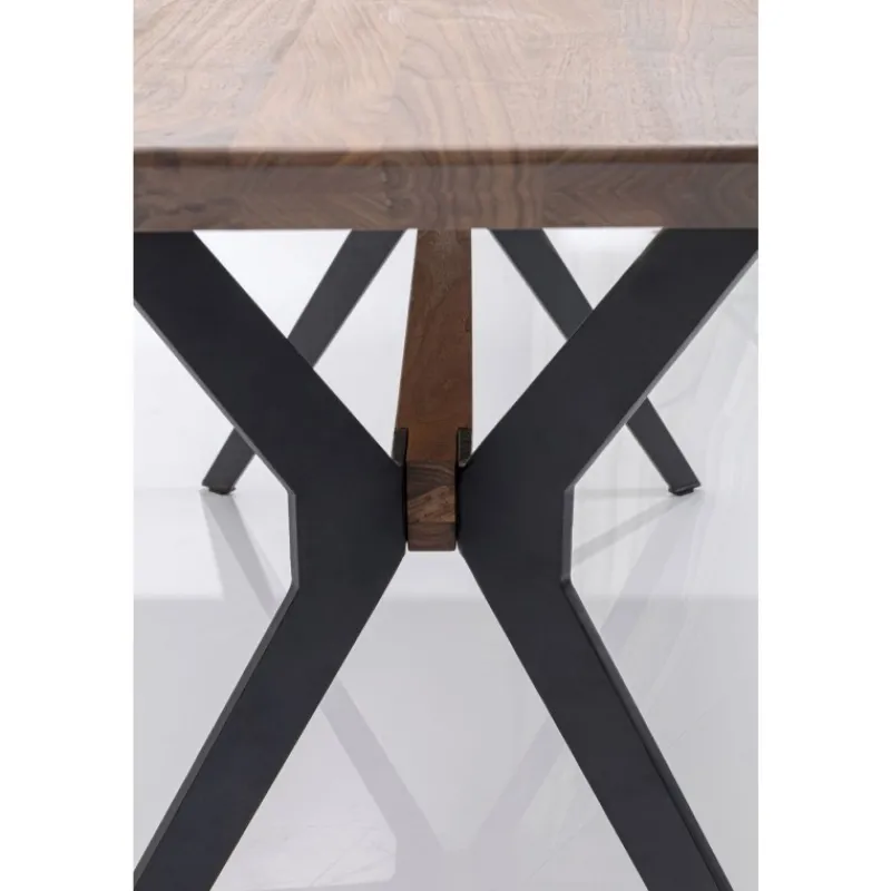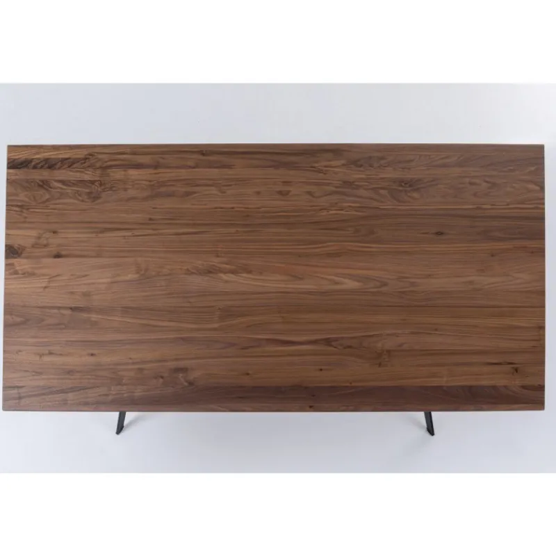 Mesa Downtown com tampo em nogueira e pés em aço, permitindo mais espaço para mais pessoas à mesa; Um tampo sólido …