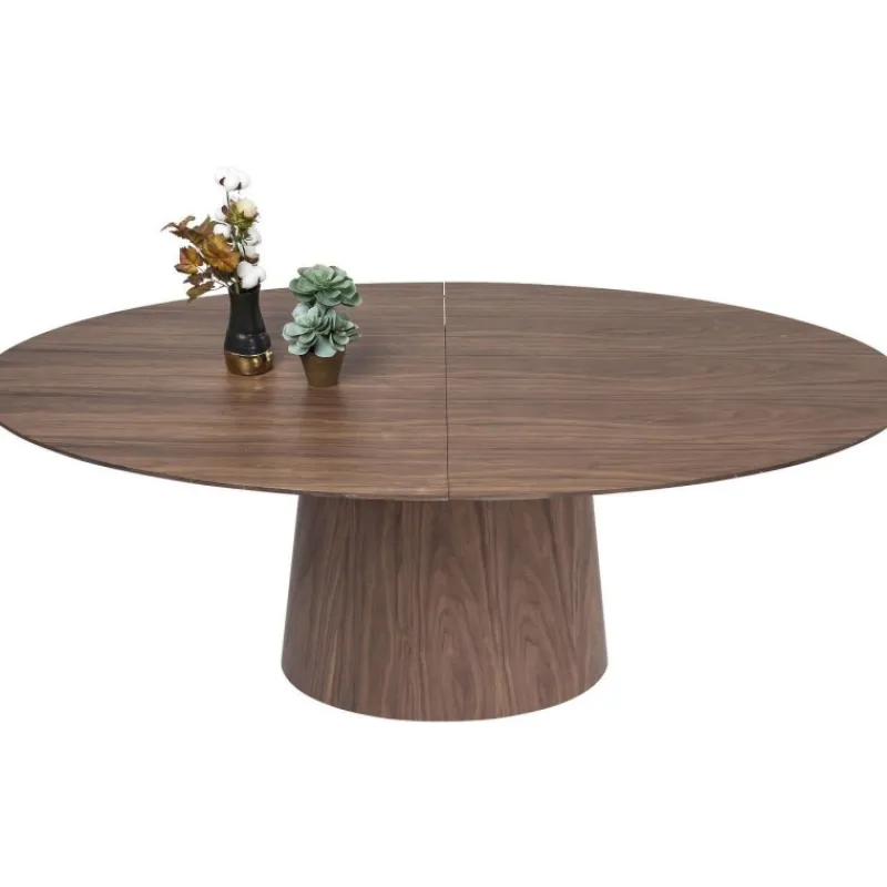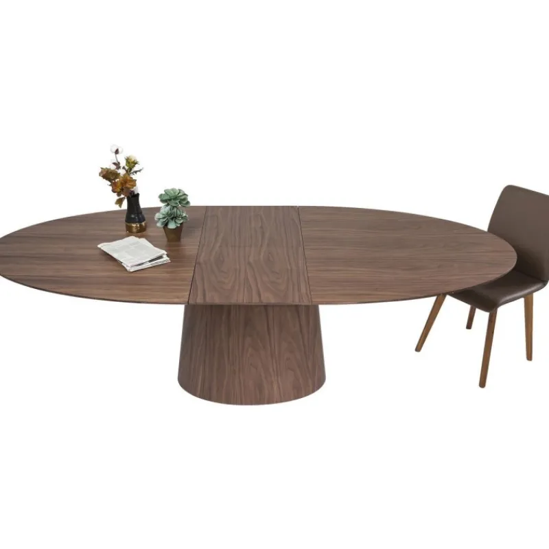 Elegância com sistema. Esta mesa de refeições elíptica combina funcionalidade com design. Extensível de 200-250 cm. Espessura do tampo de 3cm. Material: MDF, folheado de nogueira castanho. Disponível também em MDF lacado branco brilhante.