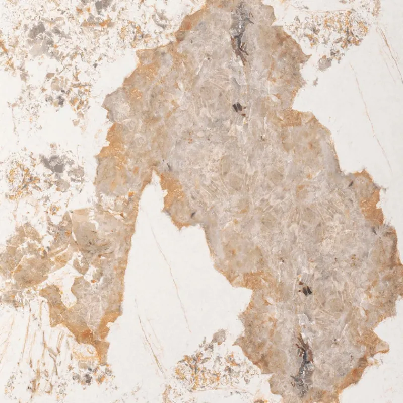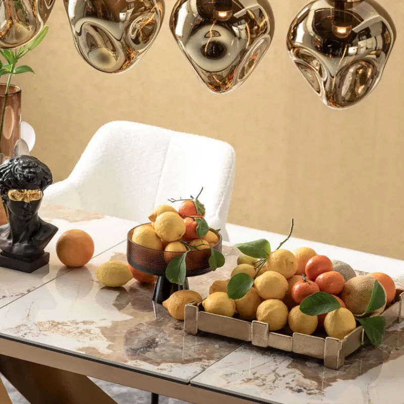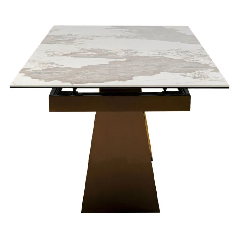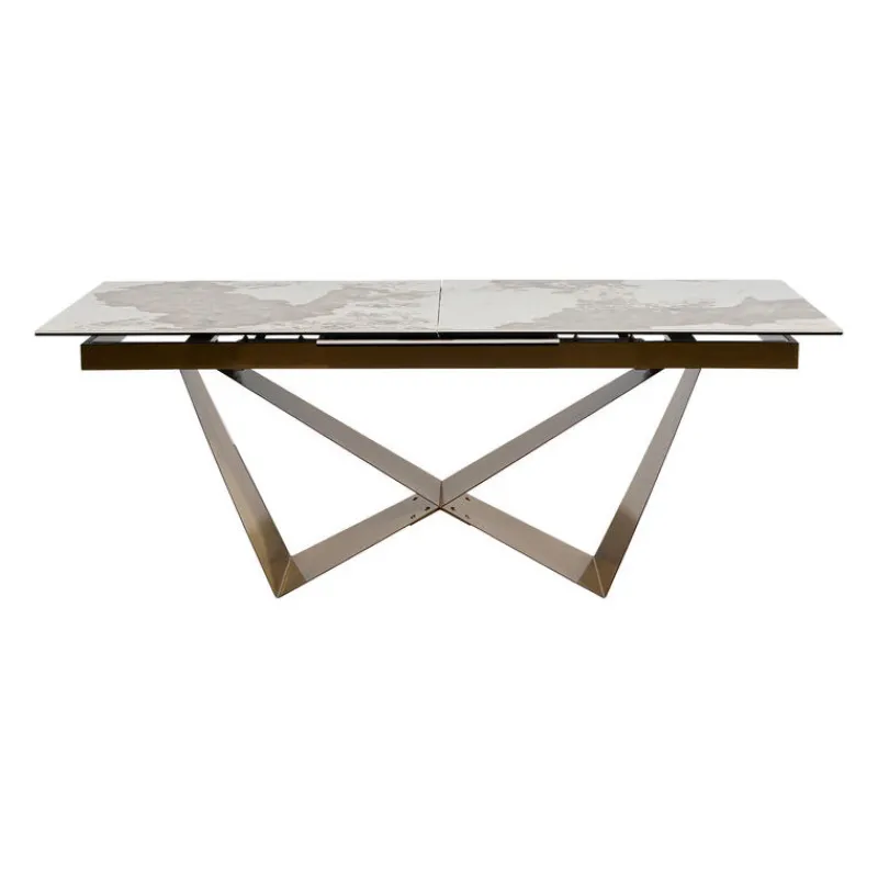 Esta mesa de jantar contemporânea combina uma base de design em aço dourado com um tampo único em grés branco montad…