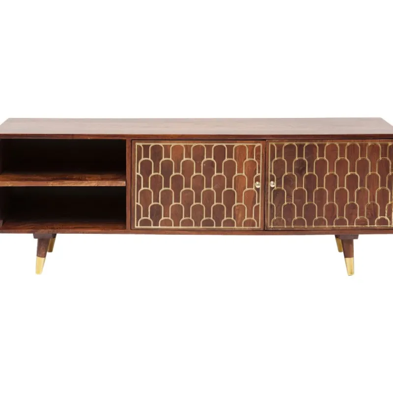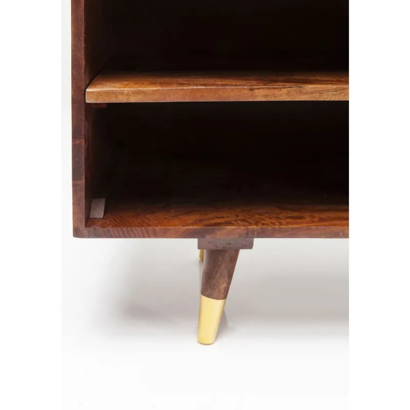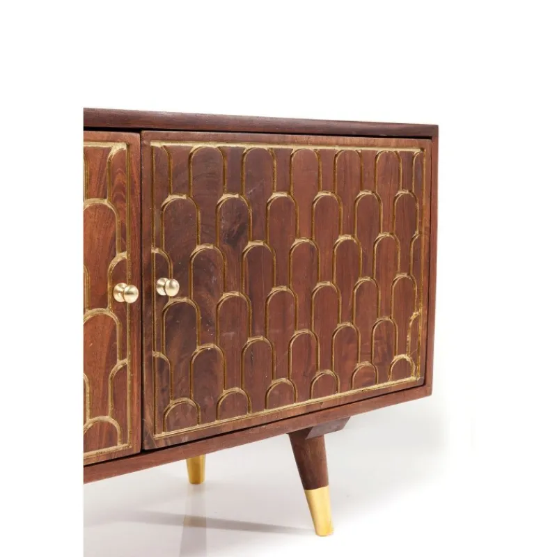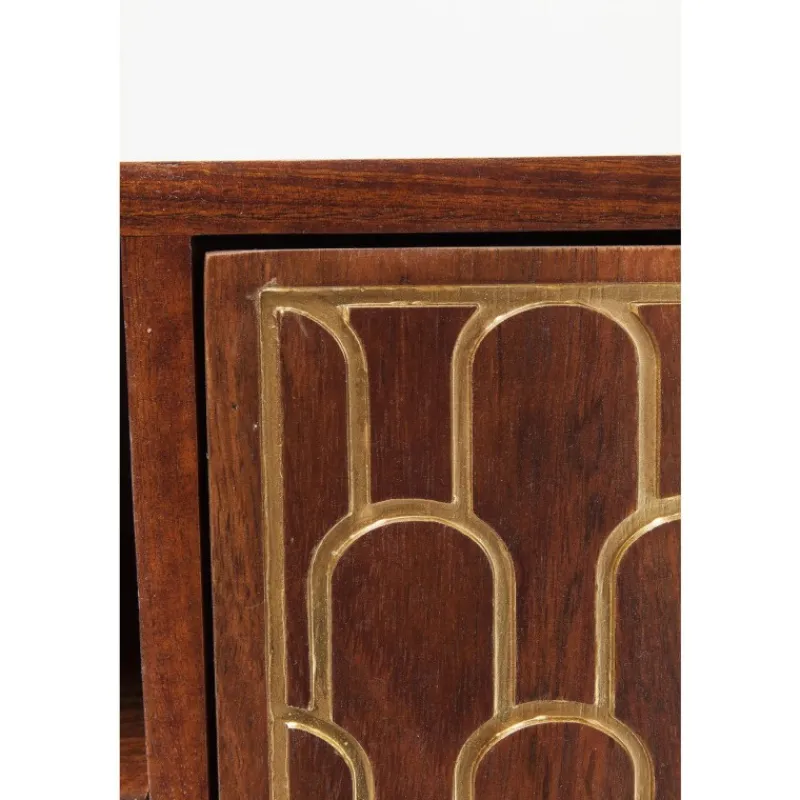 Cómoda compacta, feita à mão, em madeira maciça de manga com decoração oriental gravada, dourado, três gavetas e duas prateleiras. Quer seja no quarto, no corredor ou na sala: oferece espaço de arrumação para a lavandaria e loiça e, com estilo, pode ser o cenário para livros, candeeiros, vasos e TV. Perfeitamente imperfeito: os ornamentos gravados e dourados são feitos à mão e têm o seu próprio carácter individual. Parece um objecto encontrado num antiquário e conquista imediatamente o coração de todos os amantes do retro. Muskat é uma colecção de móveis com outros modelos, como uma comoda ou um armário.