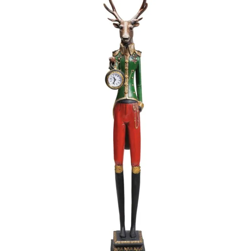 Charmosa figura de veado que diz as horas. Um veado finamente vestido com um toque prático. Um atractivo genial com um elegante relógio com numerais romanos.