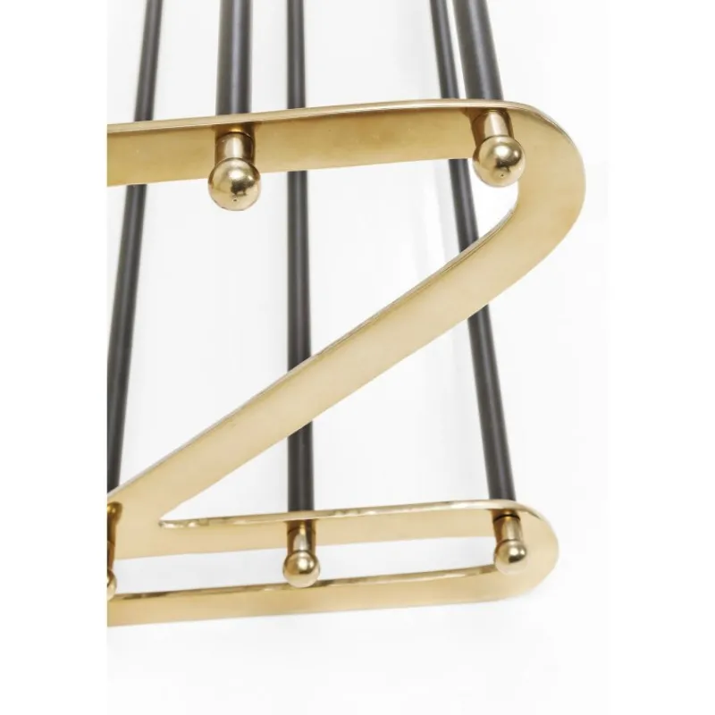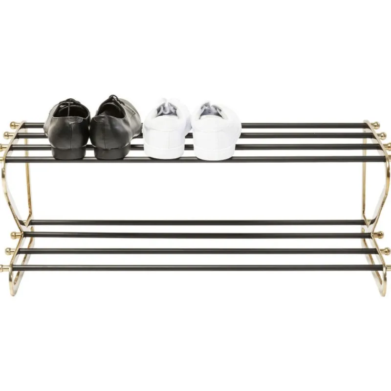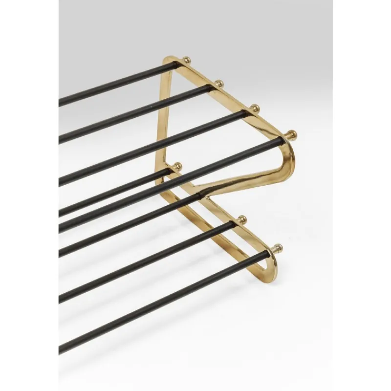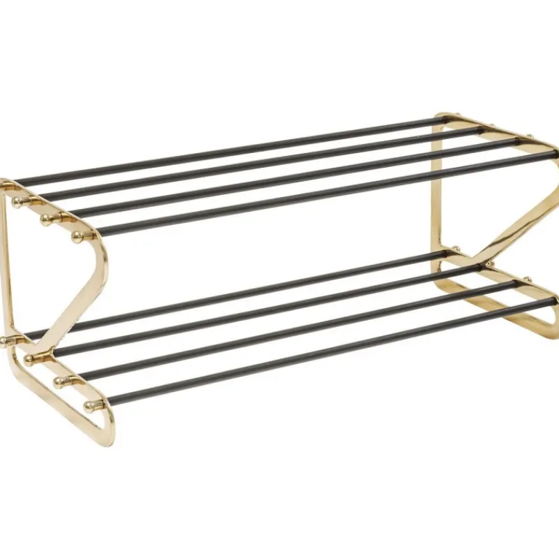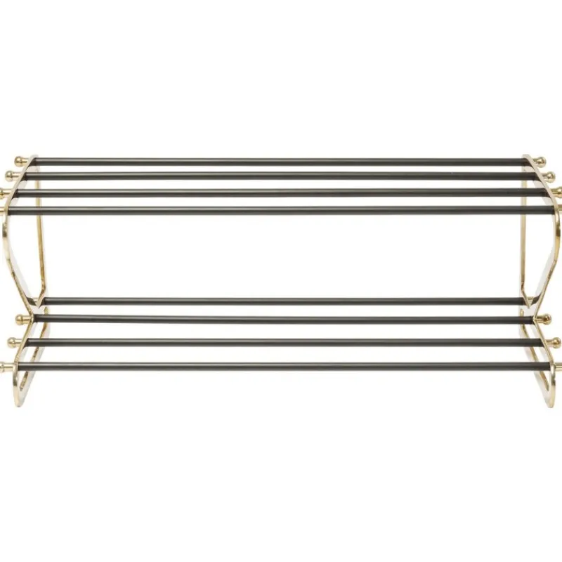 Uma sapateira versátil: como apoio, simples estante ou mesa para o jornal. A sapateira de dois níveis impressiona com a sua estrutura dourada e varetas redondas em lacadas a preto.