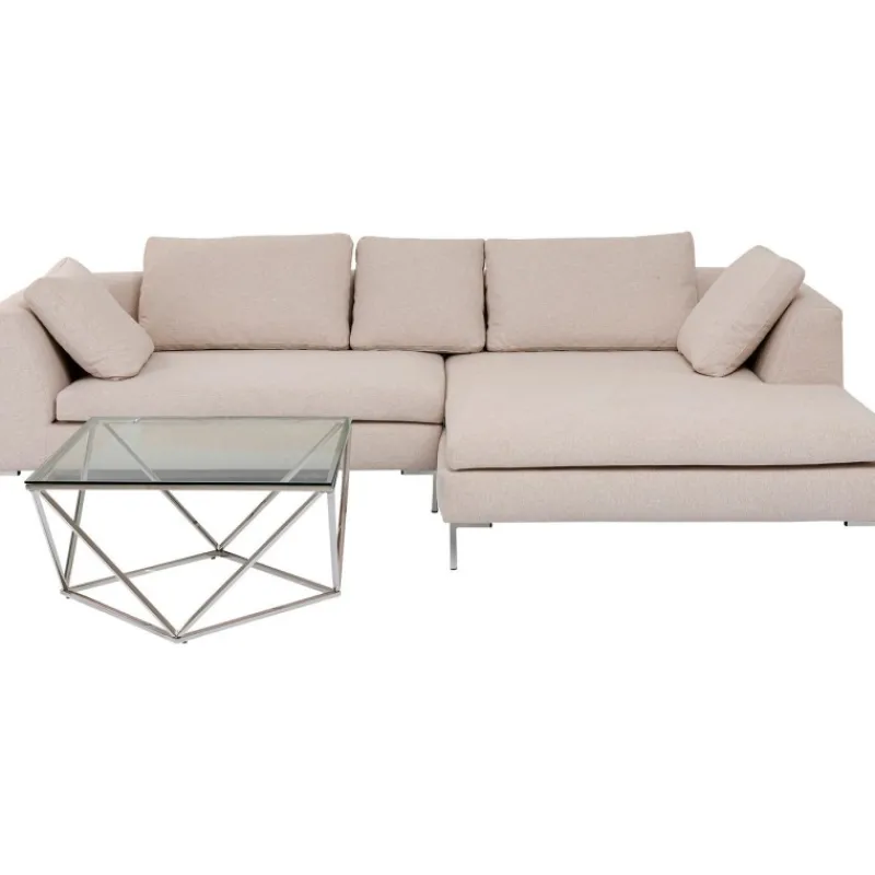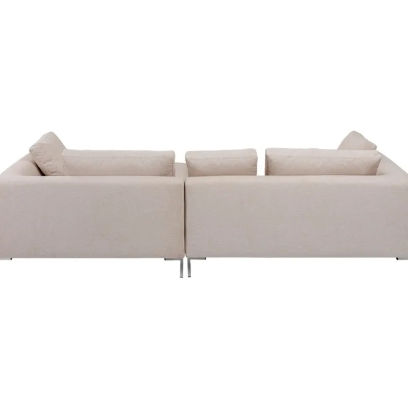 Um sofá de designer compacto como solução de canto para qualquer sala de estar – um clássico moderno! Basta deixar-se cair e inclinar-se para trás – isso sabe bem. Depois ponha os pés para cima – sabe ainda melhor! É exactamente por isso que o sofá de canto Gianni combina um espaço generoso para sentar com uma chaise longue, tudo ultra-confortável. Este sofá de canto de cor clara mostra um design simples. O sofá de sala de estar ideal para famílias com crianças ou animais de estimação. Sofá de canto em creme, incluindo 5 almofadas para o máximo conforto de assento e muito espaço para abraçar, Um parceiro de estilo para realmente todos os estilos de mobiliário, que parece extra arejado graças à sua cor clara e moldura cromada Chega de medo de manchas! Graças à sua tecnologia de limpeza fácil, o tecido dos estofos repele a sujidade e a água – altamente prático! Gianni é uma série de sofás de canto em várias cores e tamanhos, opcionalmente com uma chaise-longue à direita ou à esquerda